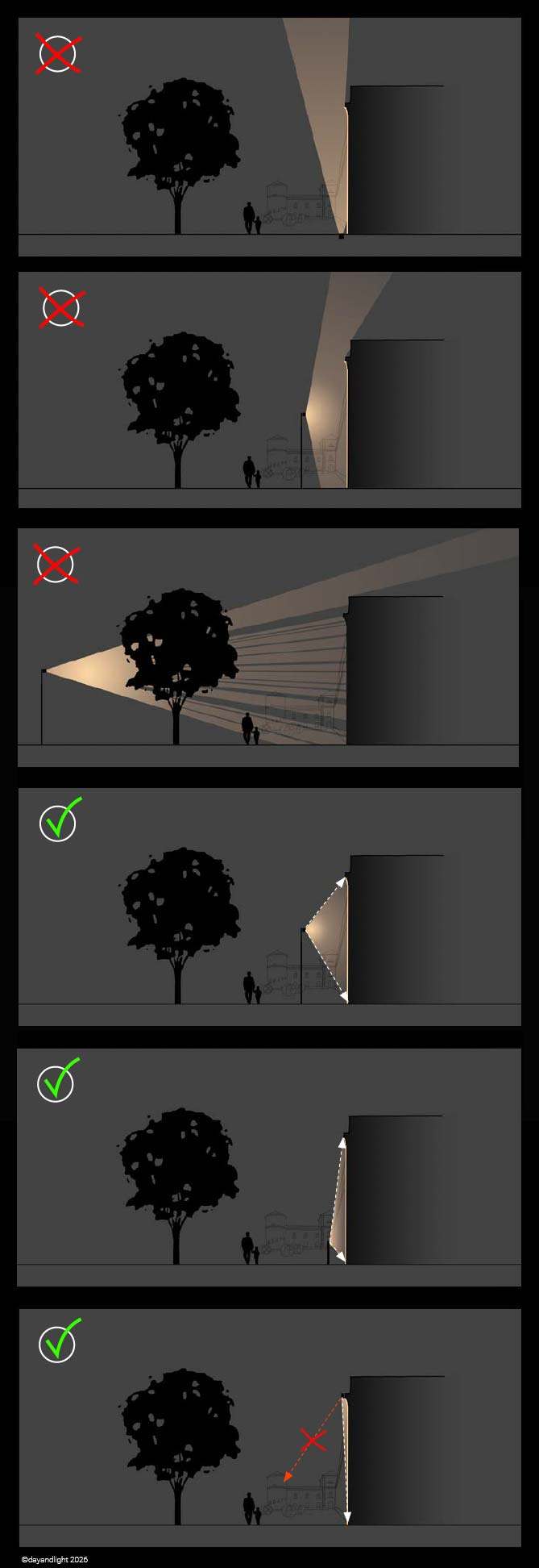 Durch gezielte Lichtverteilungen einzelner Lichtpunkte sowie den bewussten Einsatz von Schatten und Kontrasten wird die geometrische Struktur und Beschaffenheit eines Gebäudes deutlich hervorgehoben. Im Gegensatz dazu lässt eine großflächige, formlose Ausleuchtung die Besonderheiten des Bauwerks schnell verblassen. Eine sorgfältig geplante Fassadenbeleuchtung sollte zudem stets in Abstimmung mit der Allgemeinbeleuchtung der Innenräume erfolgen.