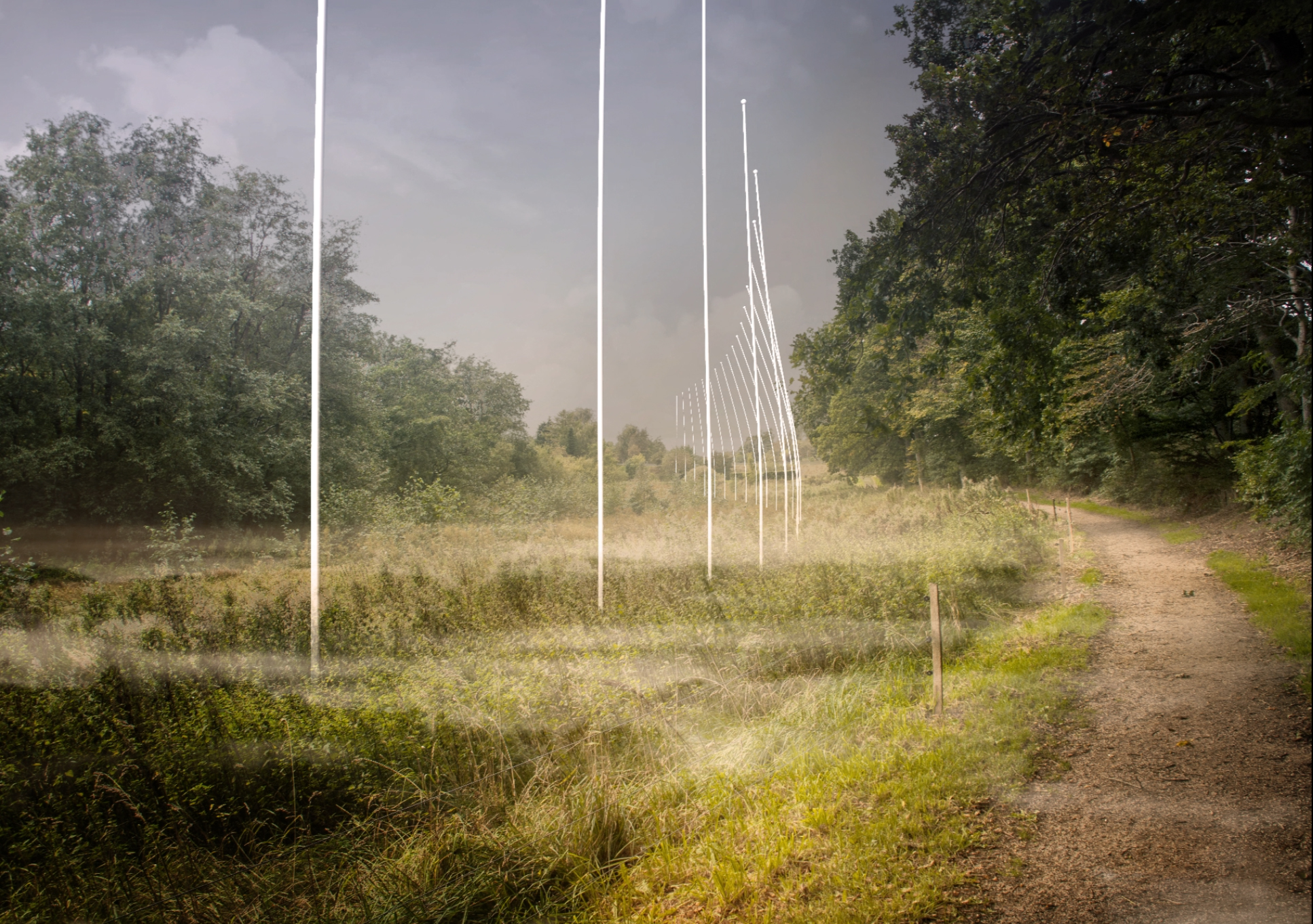 Durch die Flexibilität des Materials nehmen die Stelen die Bewegungen des Windes auf und zeichnen eine eigene Dynamik durch sanfte Wellenbewegungen, welche sich entlang des gesamten Landschaftsparks fortsetzen.