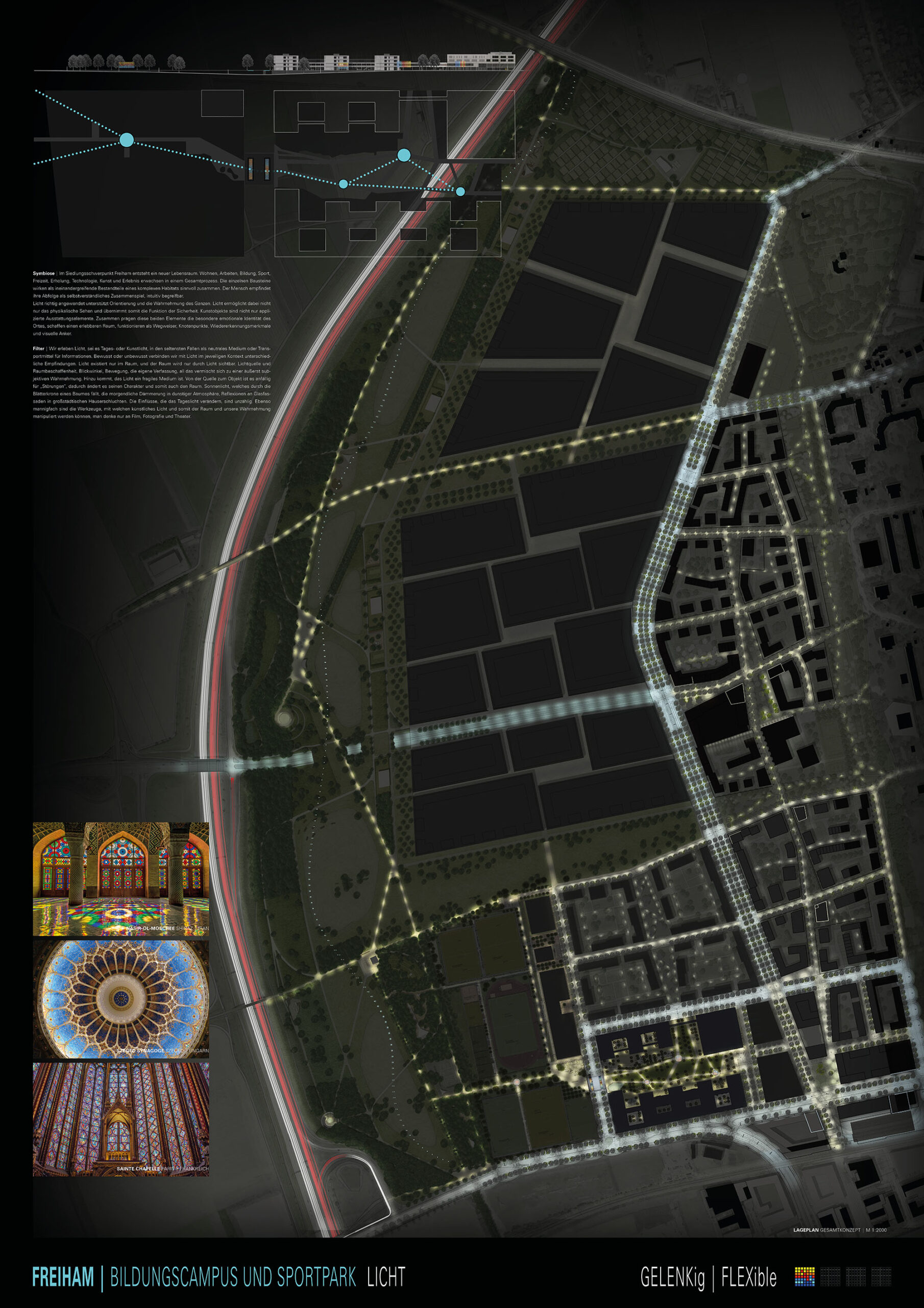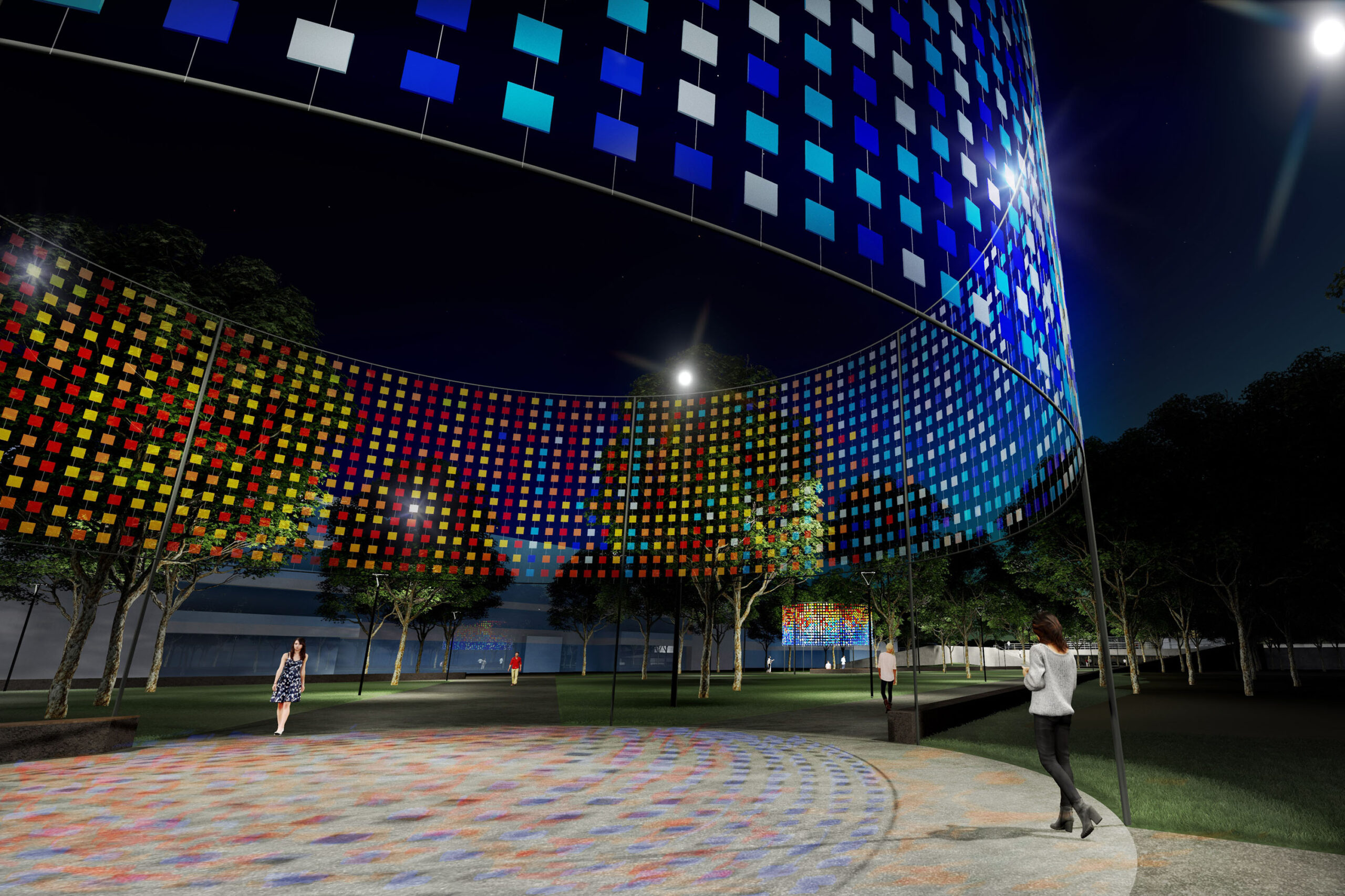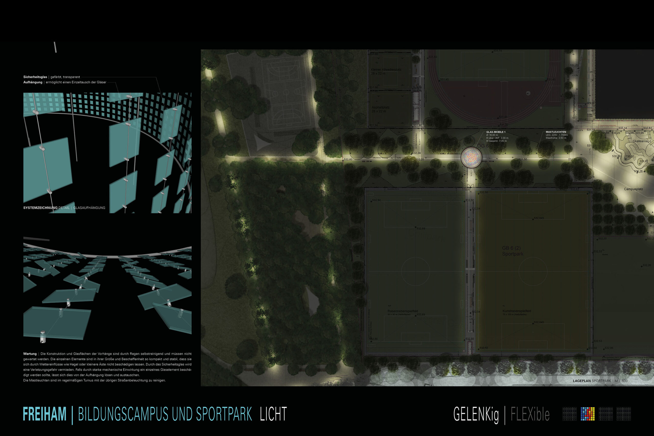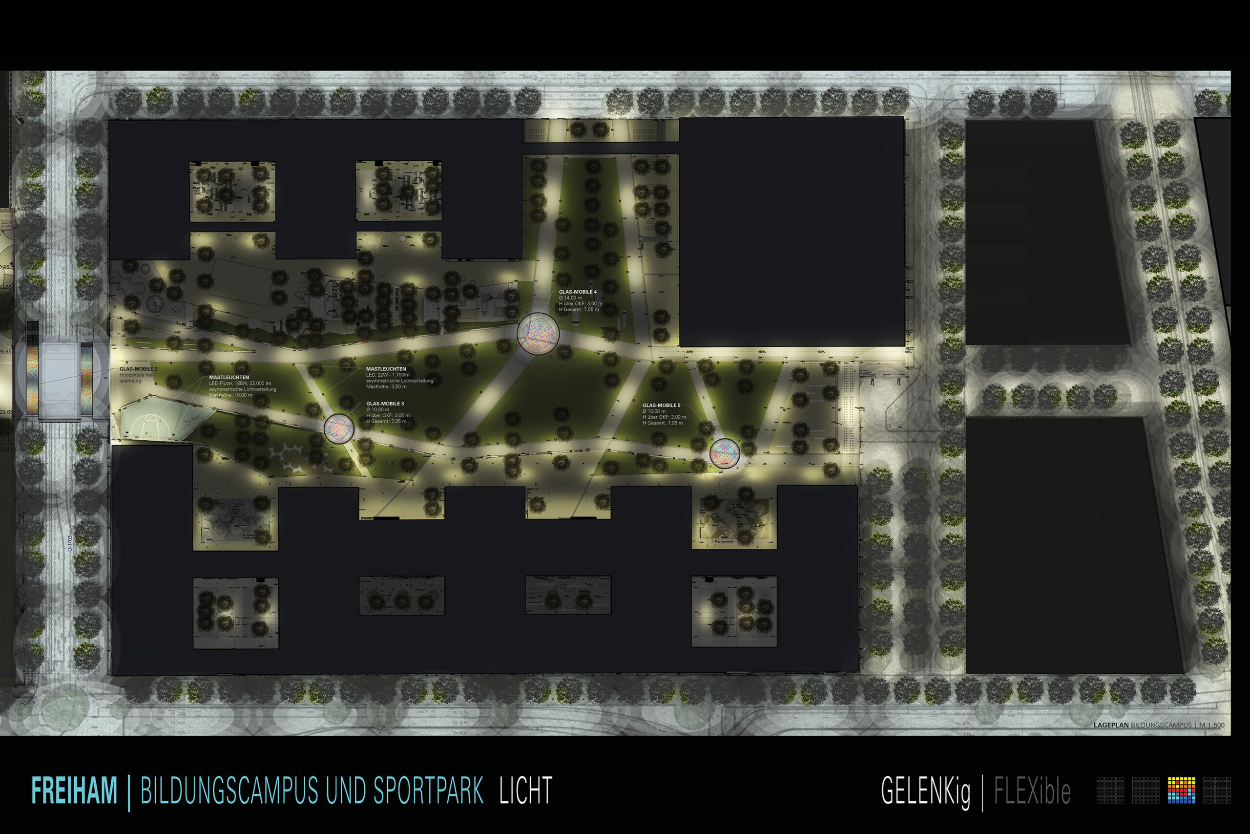 Glas-Mobiles | An besonderen Sicht- und Wegeverbindungen im Bildungscampus und Sportpark entstehen Gelenke aus in Ringen angeordneten Glas-Mobiles. Von jedem der Gelenkpunkte ist bereits der nächste Punkt sichtbar. Durch die Veränderung von Tageslicht und Kunstlicht werden die Lichtvorhänge tagsüber und nachts Bestandteil des Parks, so wie der Park im Gesamten Bestandteil der Installation ist. Durch das einfallende Sonnenlicht entstehen frei interpretierbare Sonnenuhren und wandelnde Lichtmuster als Projektionen auf den Parkflächen. Abends entstehen durch die Filterung und Reflexionen der Anstrahlung unterschiedliche Kaleidoskop-artige Farbmuster an den jeweiligen Wegkreuzungen. Es wird eine Palette aus sechs Farben verwendet: Gelb, Orange, Rot, Cyan, Blau und Dunkelblau. Während die Beleuchtung durch das Kunstlicht selbst statisch bleibt, verändert sich das Lichtbild geringfügig durch leichte Bewegungen der Gläser im Wind. Es entsteht der Eindruck eines fluiden Lichts, wie man es aus Sakralbauten kennt. Es erweckt den Raum zum Leben und verleiht einen nahezu transzendenten Charakter. Gleichzeitig interagiert es nicht nur mit der Umgebung, sondern auch mit den Menschen, die sich darin bewegen, als tauche man durch Licht.