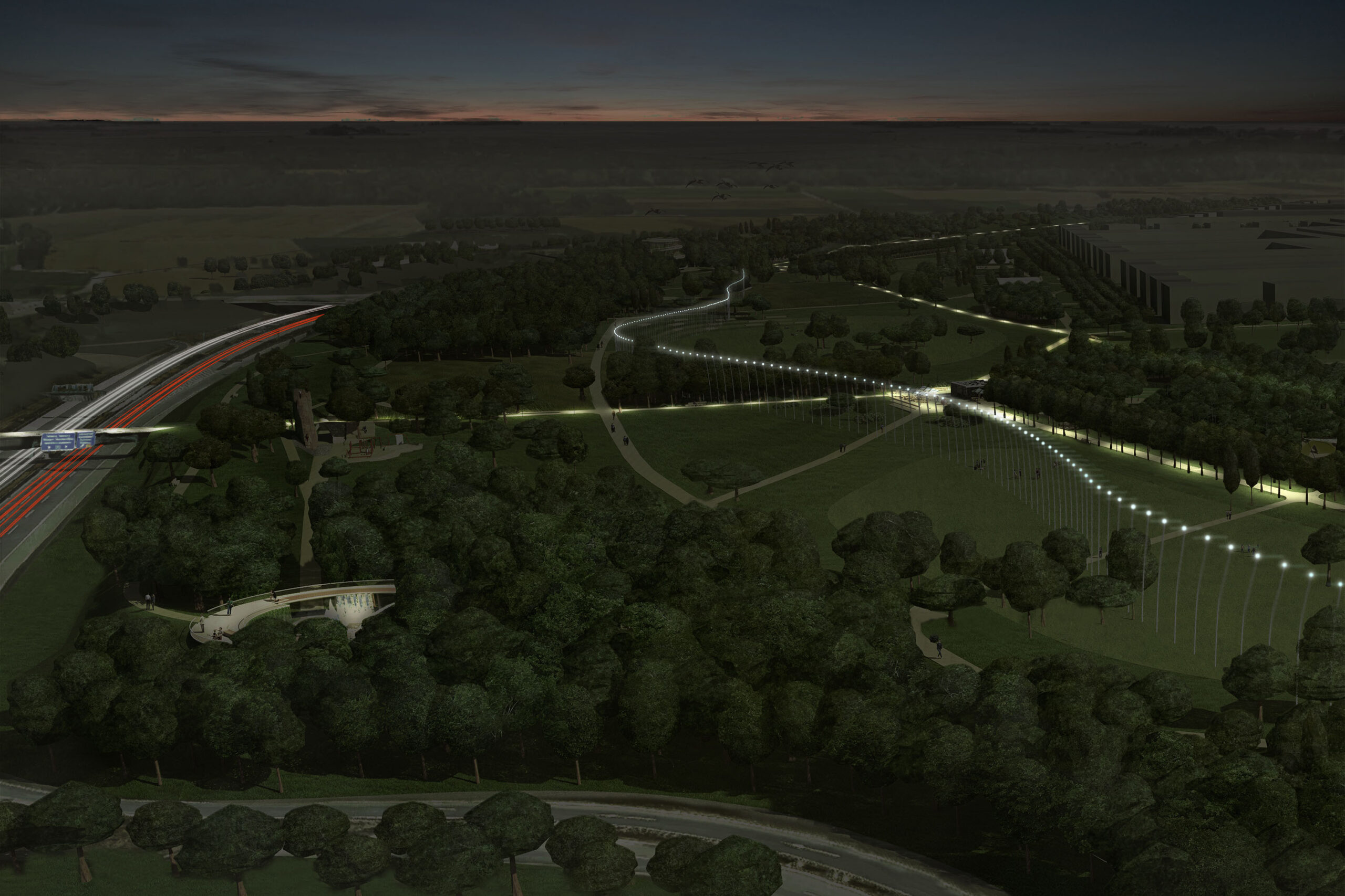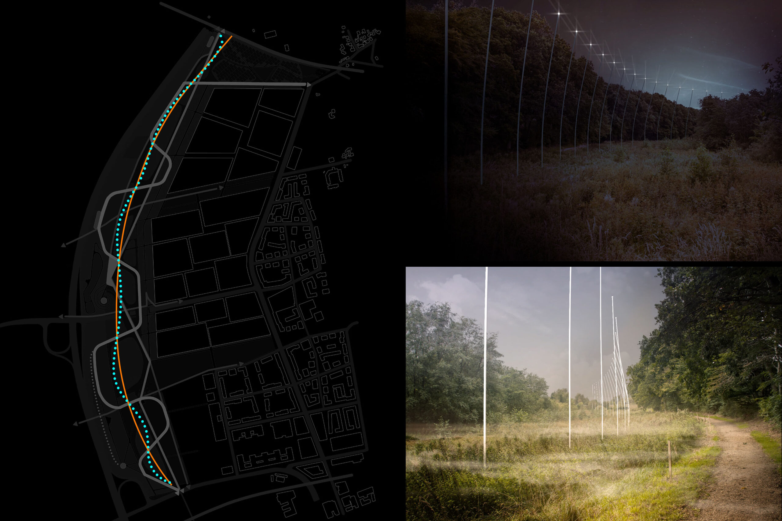 Landschaftspark | Während sich die Lichtelemente in Sport- und Bildungspark in einen urbanen Charakter einfügen, verändert sich die Installation im Landschaftspark hin zu einem floralen und naturgeprägten Thema. Eine Reihe flexibler schlanker Stelen folgt der Geometrie der übergeordneten Bewegung des Parks, nimmt die Formen und Bewegungen der Bäume und Pflanzen durch Wind, Wetter und Jahreszeiten auf und schafft eine abstrakte Geste in der natürlichen Umgebung. Die Anordnung erzeugt eine untergeordnete sanfte Wellenform, welche sich mit den Schnittpunkten der großen Geste des Parkverlaufs an bestimmten Punkten der Parkwege kreuzt, streckenweise den Weg begleitet und sich dann wieder entfernt.