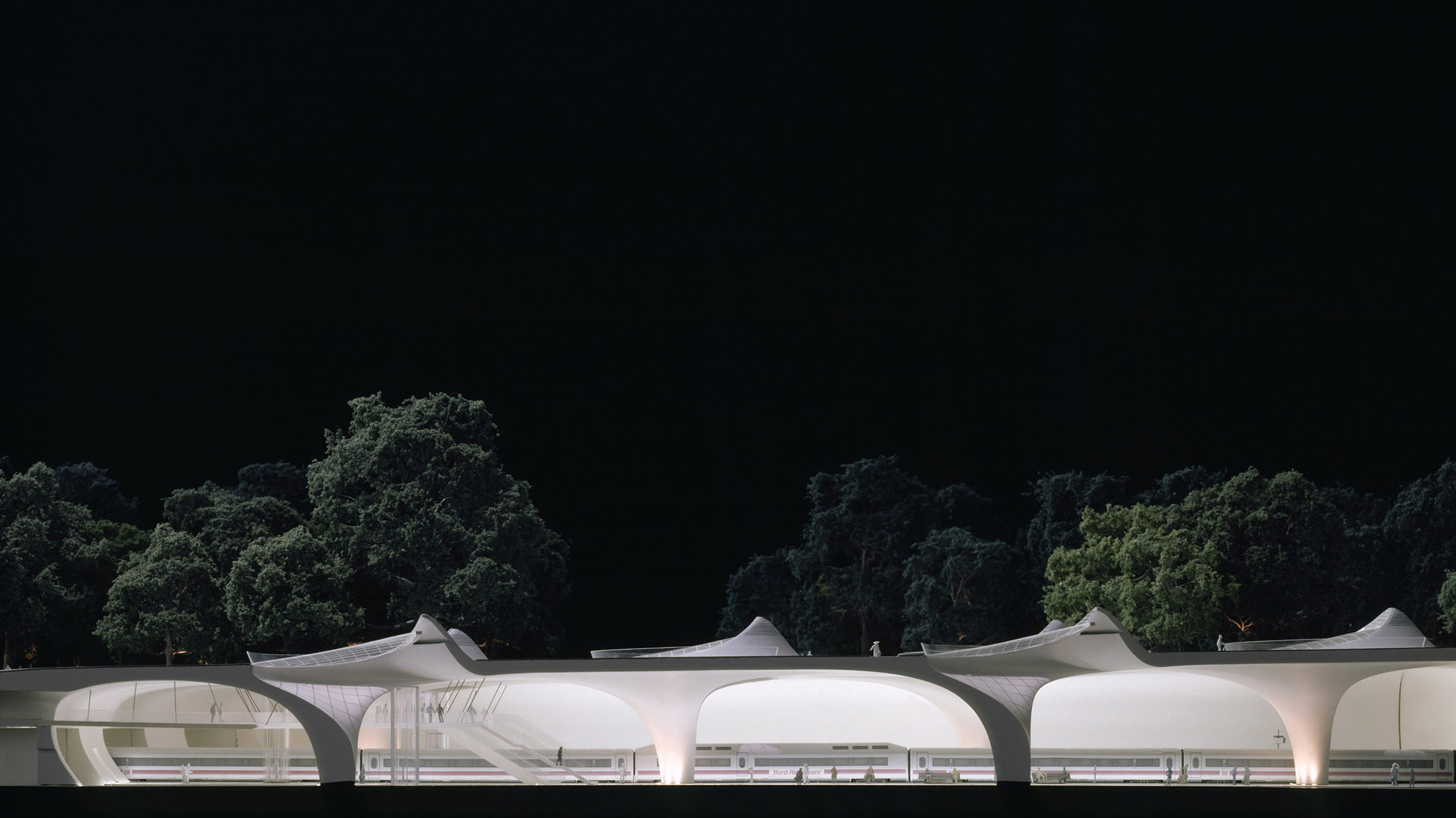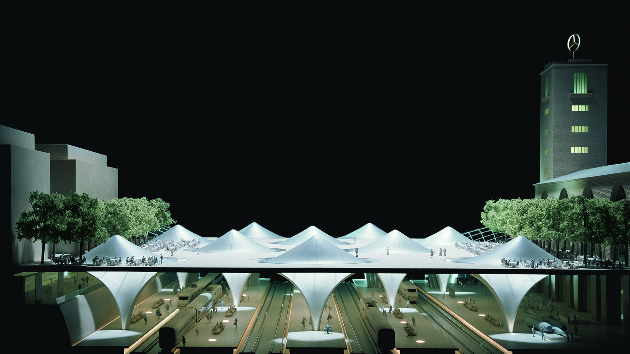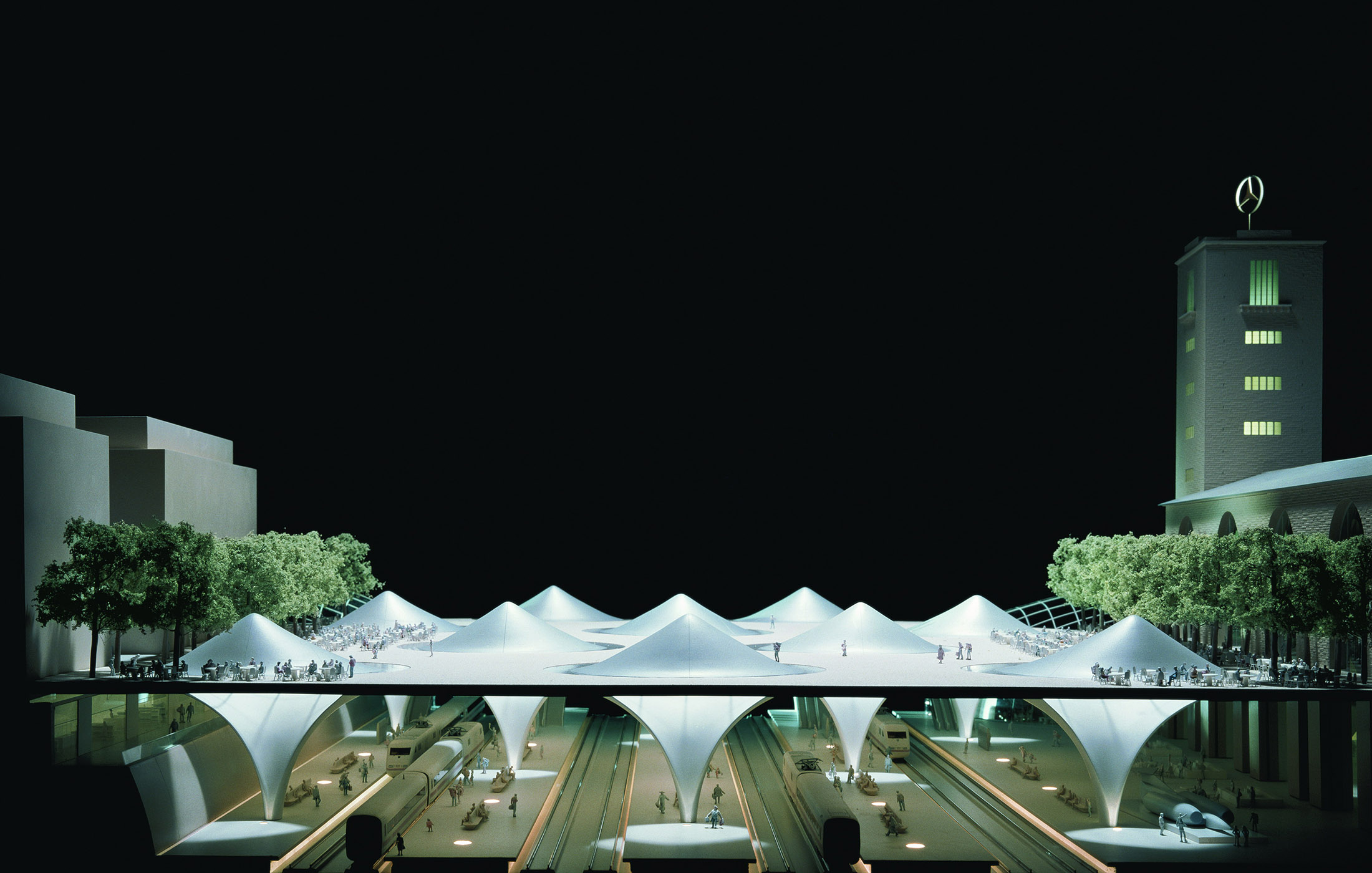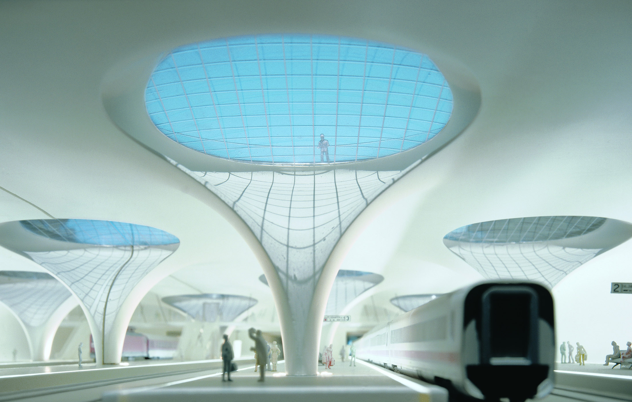 1997 und 2001 machten wir die ersten Tageslichtmessungen an Modellen unterschiedlichen Maßstabs, um fundierte Aussagen über den Tageslichteinfall zu machen. Das Tageslicht ist essenzieller Bestandteil der Bahnhofshalle, die sich unter einer Parkfläche neben dem historischen Bonatz-Bau erstreckt. Die geschwungene Kelchform der Stützen leitet das Licht fließend in den Raum und vermittelt trotz der unterirdischen Lage auf elegante Weise den Eindruck einer modernen tageslichtdurchfluteten Bahnhofshalle.