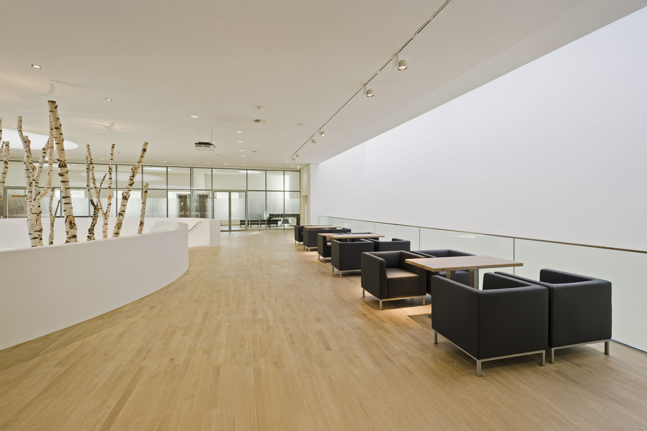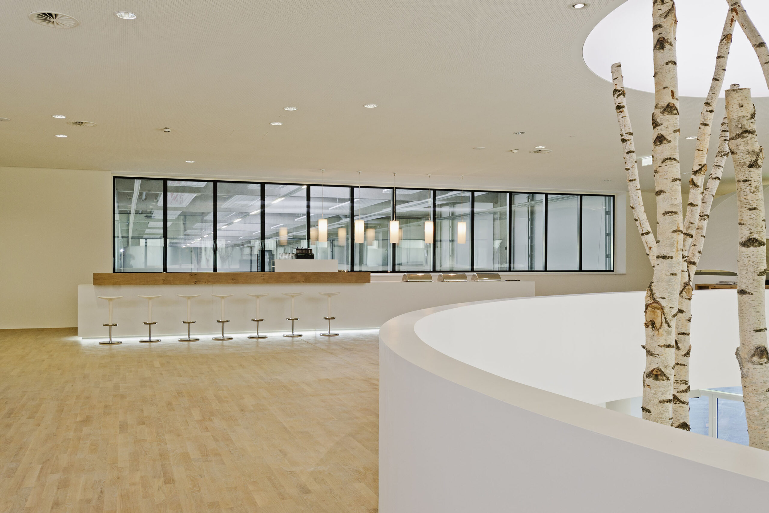 Dementsprechend vielschichtig waren auch die Anforderungen an die Beleuchtung. Der Showroom des Outlet-Centers erhielt eine flexible Ausstellungsbeleuchtung. Während dort durch große Schaufenster auf zwei Seiten großzügig Tageslicht einfällt, ist der Baukörper im Obergeschoss ohne Fenster – dort versorgen Oberlichter die Schulungsräume mit Tageslicht. Auch die große Rückwand über beide Geschoßhöhen erhält eine hohe Leuchtdichte durch ein darüberliegendes Oberlicht. Abends wird diese zusätzlich durch Kunstlicht aufgehellt. Tagsüber wie Abends entsteht bis in die Raumtiefe eine helle und freundliche Atmosphäre. Alle Räume sind mit einer flexiblen und vielseitigen Beleuchtung ausgestattet, die stets ein gutes Raum- und Ausstellungslicht gewährleistet: Eine Gleichmäßige Ausleuchtung ist mit punktuellen Lichtquellen für Brillanz und Plastizität perfekt kombiniert.