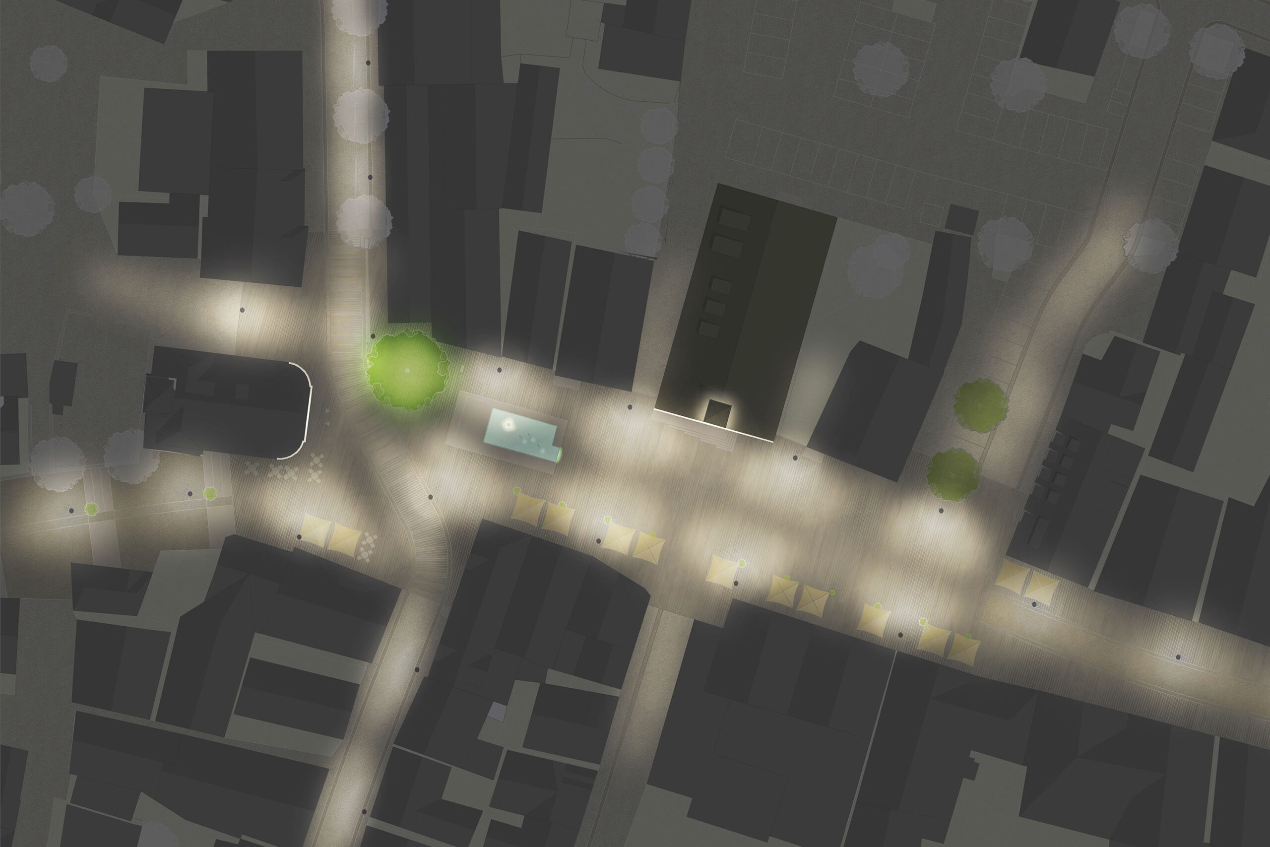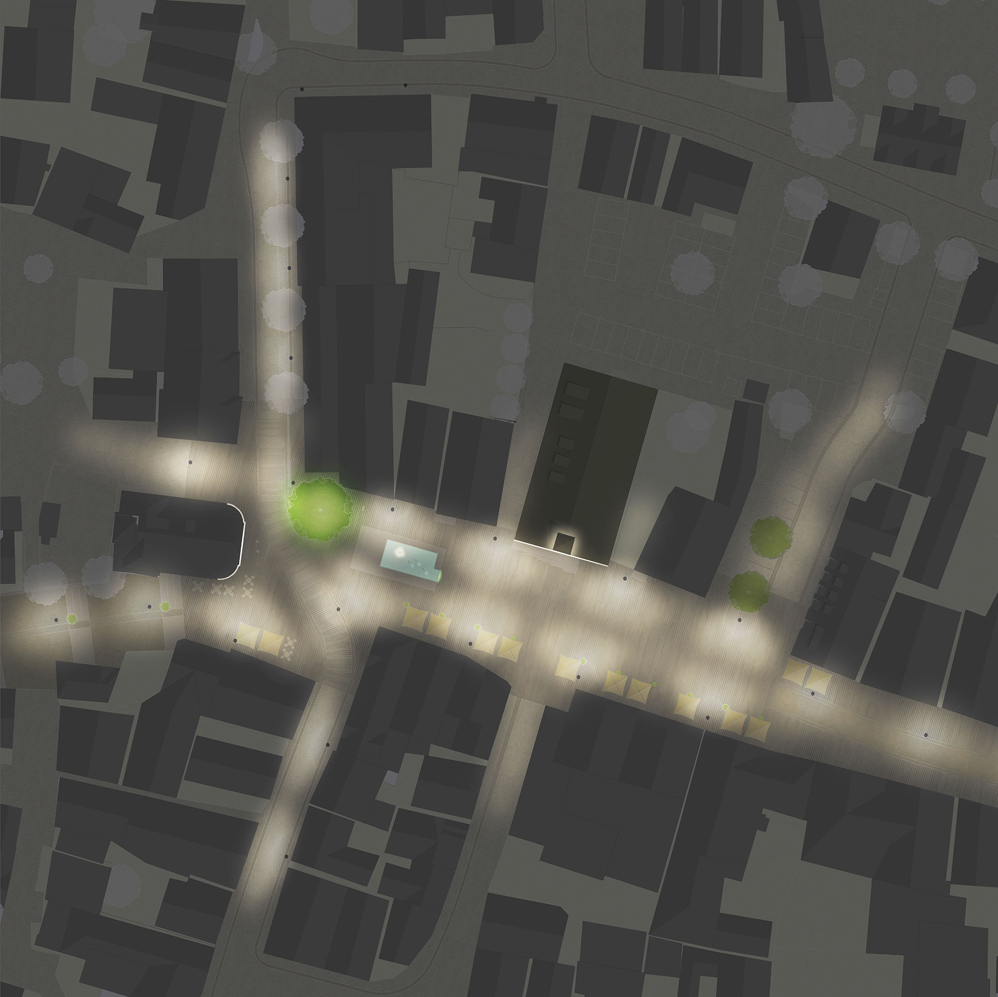Lichtkonzept | Die Beleuchtung folgt der Aufweitung des Marktplatzes durch eine zweireihige Anordnung von ca. 4,5m hohen Lichtstelen, ohne diesen räumlich zu untergliedern. So wird die Platzfläche für flexible Nutzungsmöglichkeiten freigehalten. Gestalterisch setzen die Leuchten die schlichte, unaufdringliche Formensprache der Beleuchtung der Marktstraße fort, bieten jedoch mehr Funktionalität: Neben optionalen Stromanschlüssen für Markt- und Weihnachtsbeleuchtung sowie E-Mobilität können modular zusätzliche Lichtköpfe gegenüber dem Rathaus für eine Fassadenakzentuierung hinzugefügt werden. Neben der Grundbeleuchtung schafft eine dezente Aufhellung der Fassade des alten Postgebäudes visuell einen Raumabschluß nach Westen, unterstützt durch eine Anstrahlung der großen Linde. Durch die Akzentuierung der Panscher-Skulptur sowie der Wasserkante an der östlichen Seite des Brunnentischs entsteht ein visueller Anker in der westlichen Platzmitte, entsprechend er Bedeutung des Ortes. Die atmosphärische, in warmer Lichtfarbe gehaltene Beleuchtung definiert durch ausgewogene Kontraste das Platzvolumen im nächtlichen Stadtbild und unterstützt eine belebende Außengastronomie. Es entsteht ein öffentlicher Raum mit hoher Aufenthaltsqualität.