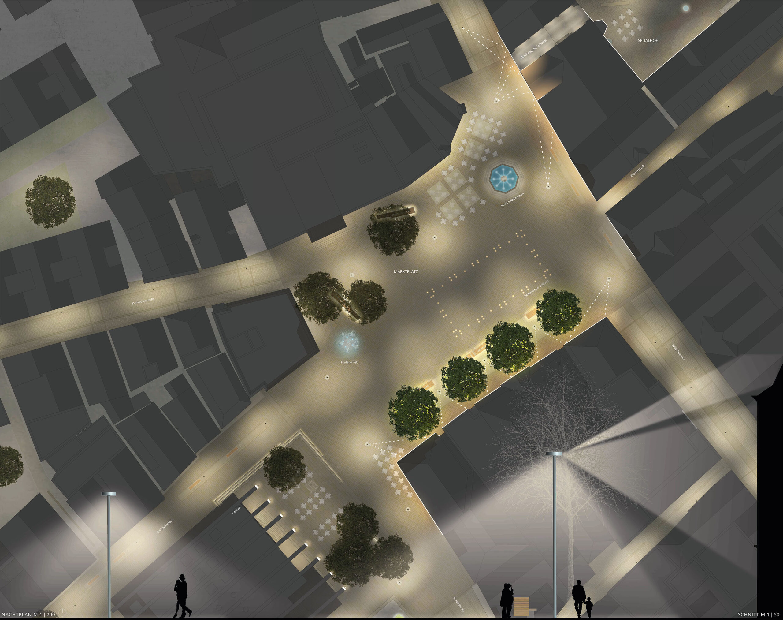 Beleuchtungskonzept | Das Beleuchtungsprinzip der Platzfläche hebt die Raumkanten hervor und definiert durch ausgewogene Kontraste das Platzvolumen als Raum. Die Leuchten sortieren sich im Südosten entlang der Baumreihe ein: Mastaufsatzleuchten mit ca. 8m Höhe leuchten sowohl zu Platzfläche hin als auch in die Bäume. Diese werden zusätzlich von unten beleuchtet und bieten somit einen lauschigen und freundlichen Aufenthaltsraum. Mit zusätzlichen integrierten Lichtoptiken werden die östlichen Fassaden – insbesondere des Spitals – dezent aufgehellt, wodurch der Platz visuell abgeschlossen ist. Nach Südwesten ist die Staffelung von Rathaus und der differenzierten Freianlagengestaltung sichtbar.