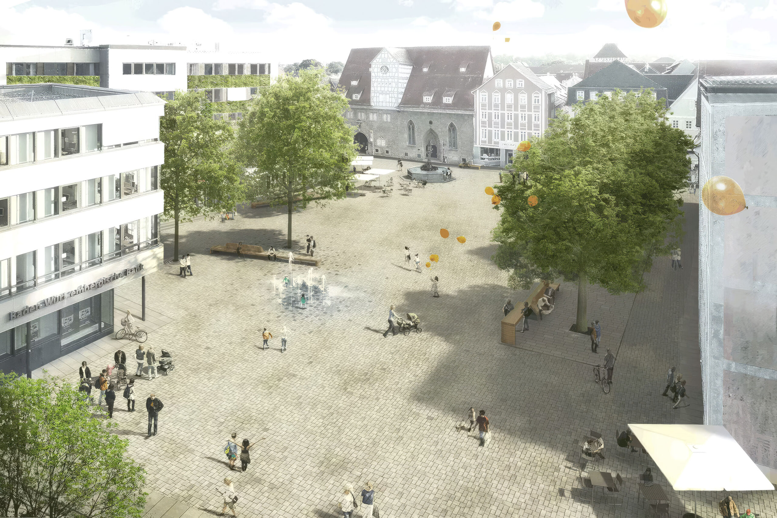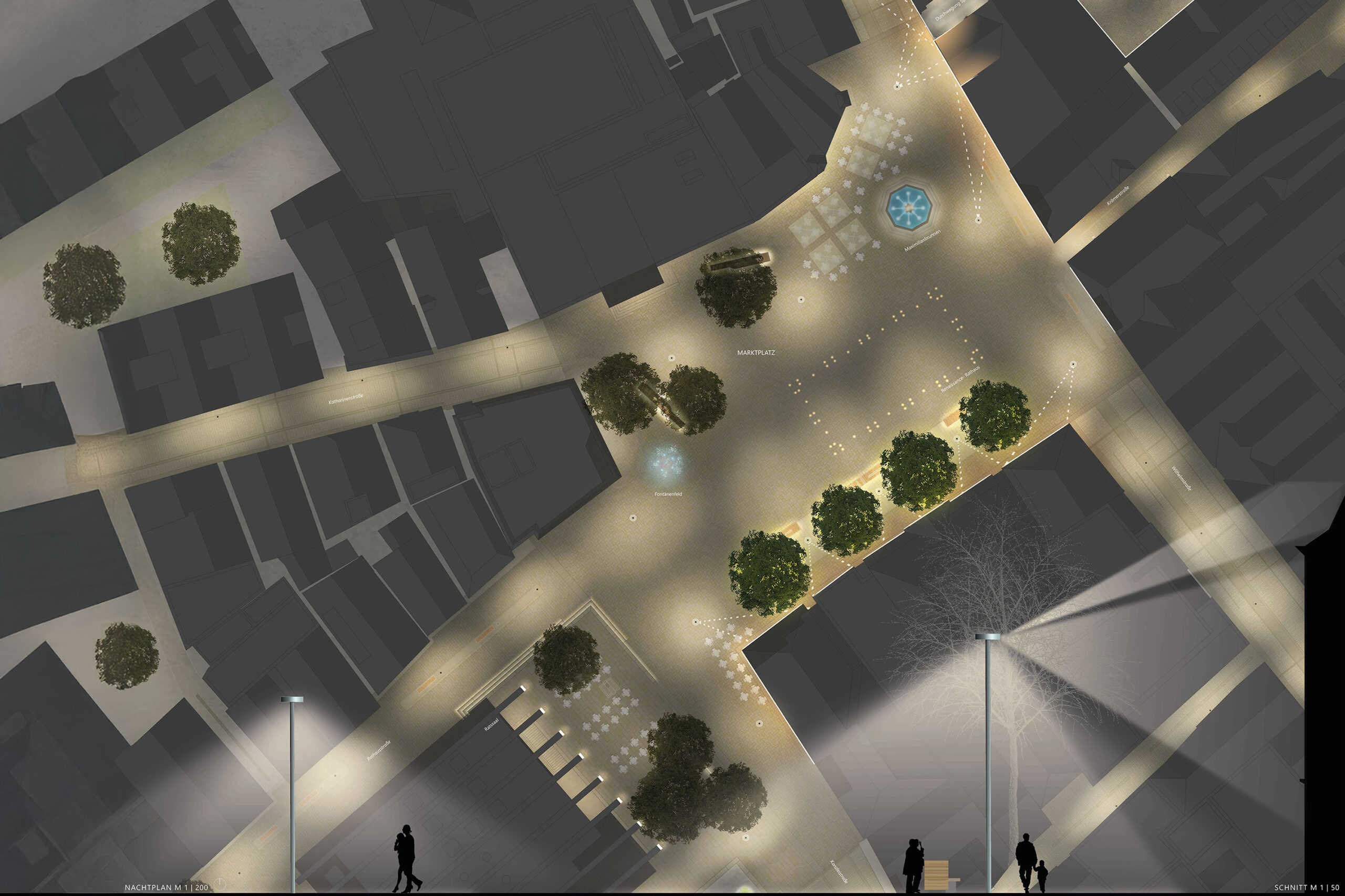 Die Grundmauern des historischen Rathauses zeichnen sich als grafisches „Lichtbild“ mittels im Boden integrierten Lichtpunkten ab, dokumentieren den einstigen Standort als Zeugnis der Stadtgeschichte und prägen die Identität des Platzes.