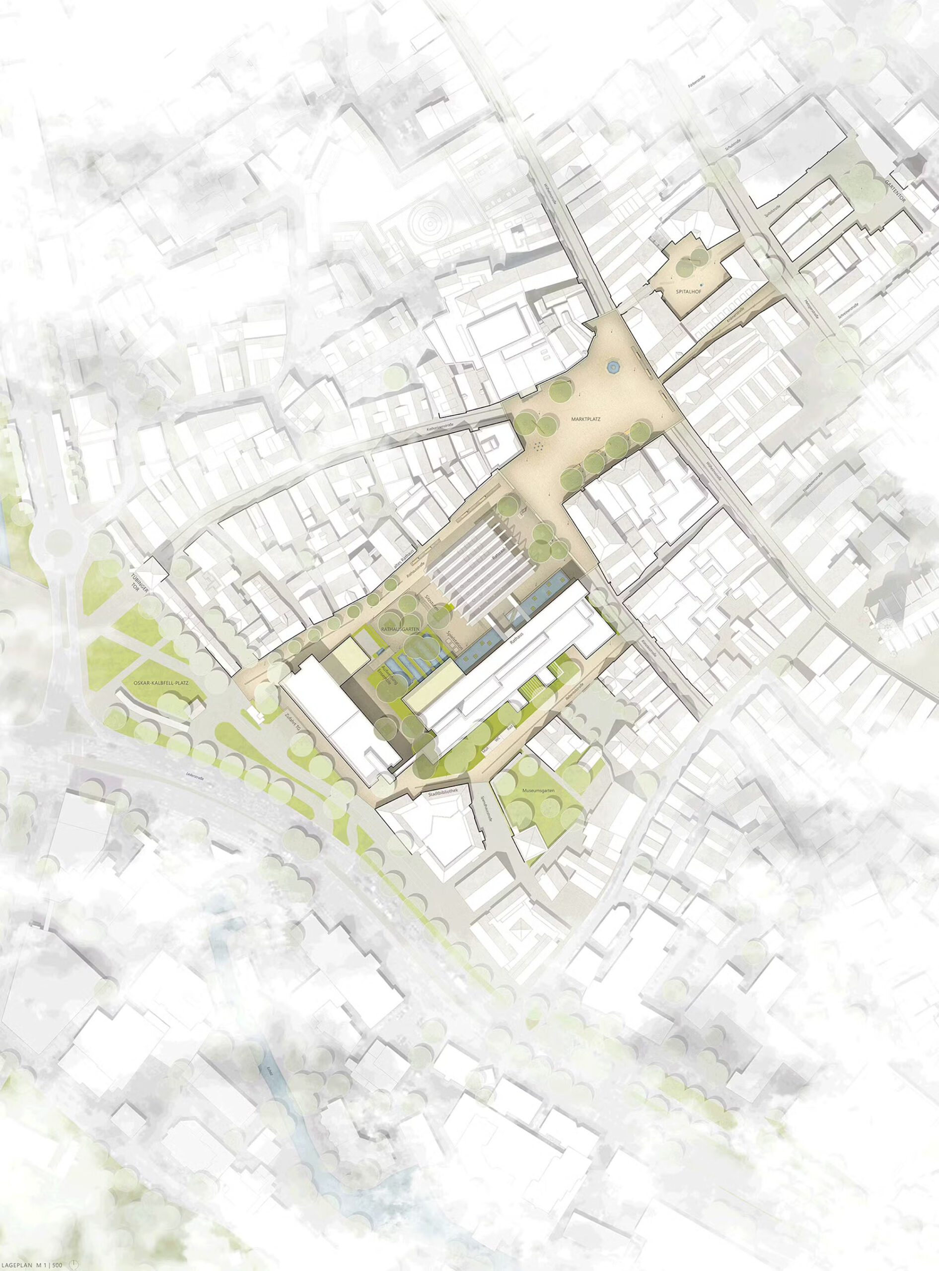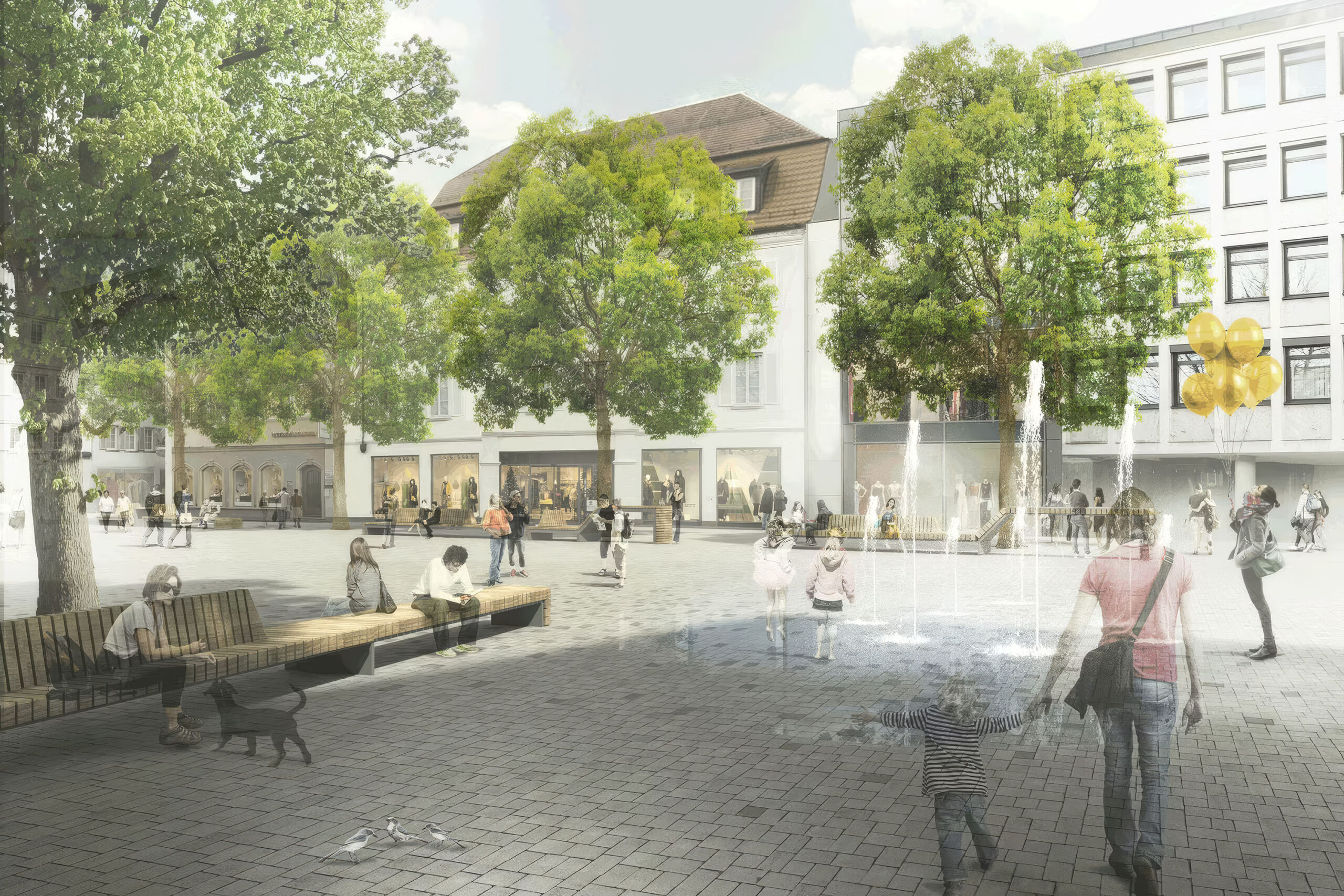 Der wesentliche Teil der Platzfläche bleibt frei von Leuchtenmasten, und es entstehen Zonen worin sich einzelne Akzente abbilden können: