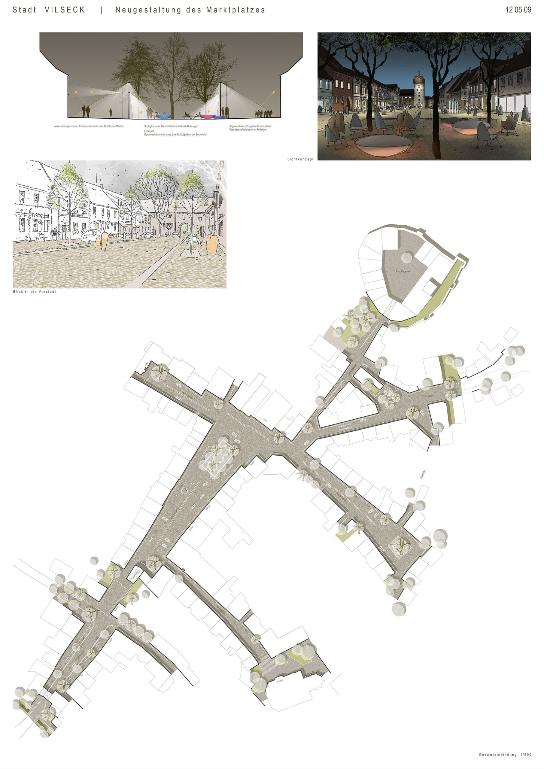 Lichtkonzept | Die Raumwirkung und der Stadtcharakter wird durch die Beleuchtung in den Vordergrund gestellt. Der Marktplatz wird zweireihig durch Mastleuchten ausgeleuchtet, deren Licht durch Kontraste auf den Platzboden Rhythmus und Gliederung des langen Raumes erzeugt. Die Helligkeit entspricht den verkehrstechnischen Anforderungen und konzentriert sich zu den Raumkanten hin. Die Fassaden werden dezent über die Reflexion des Bodens aufgehellt, ohne dass direkte Blendung in Fenster entsteht. Die Masten bilden gleichzeitig die Tragstruktur für einzelne Strahler, welche sowohl zur Gebäudebeleuchtung der bedeutenden Türme, Tore und Kirchen als auch zur Akzentuierung einzelner Fassadenelemente oder Objekte, wie z.B. Planztröge, verwendet werden. Die Anstrahlungen werden gezielt im Gesamtkonzept gesetzt, um Blickachsen und damit die Orientierung zu stärken. Dabei sollen alle Leuchtkörper mit einer hochwertigen Lichttechnik und guter Entblendung ausgestattet werden, um Streulicht zu minimieren und den Lichtkomfort zu verbessern. Weniger Blendung verbessert das Sehen und erfordert somit eine geringere Gesamthelligkeit.
