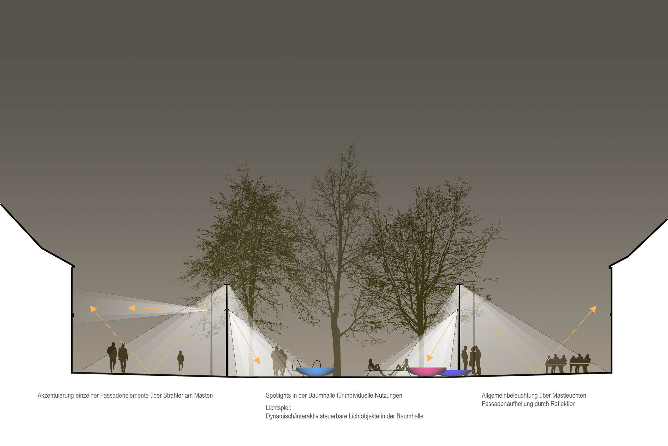 Die Ausleuchtung im Baumhain ist zurückgenommen. Sie soll bedarfsgerecht steuerbar sein: Dezente Spotlights für Akzente und ein besonderes Lichtspiel mit farblich steuerbaren Lichtobjekten.