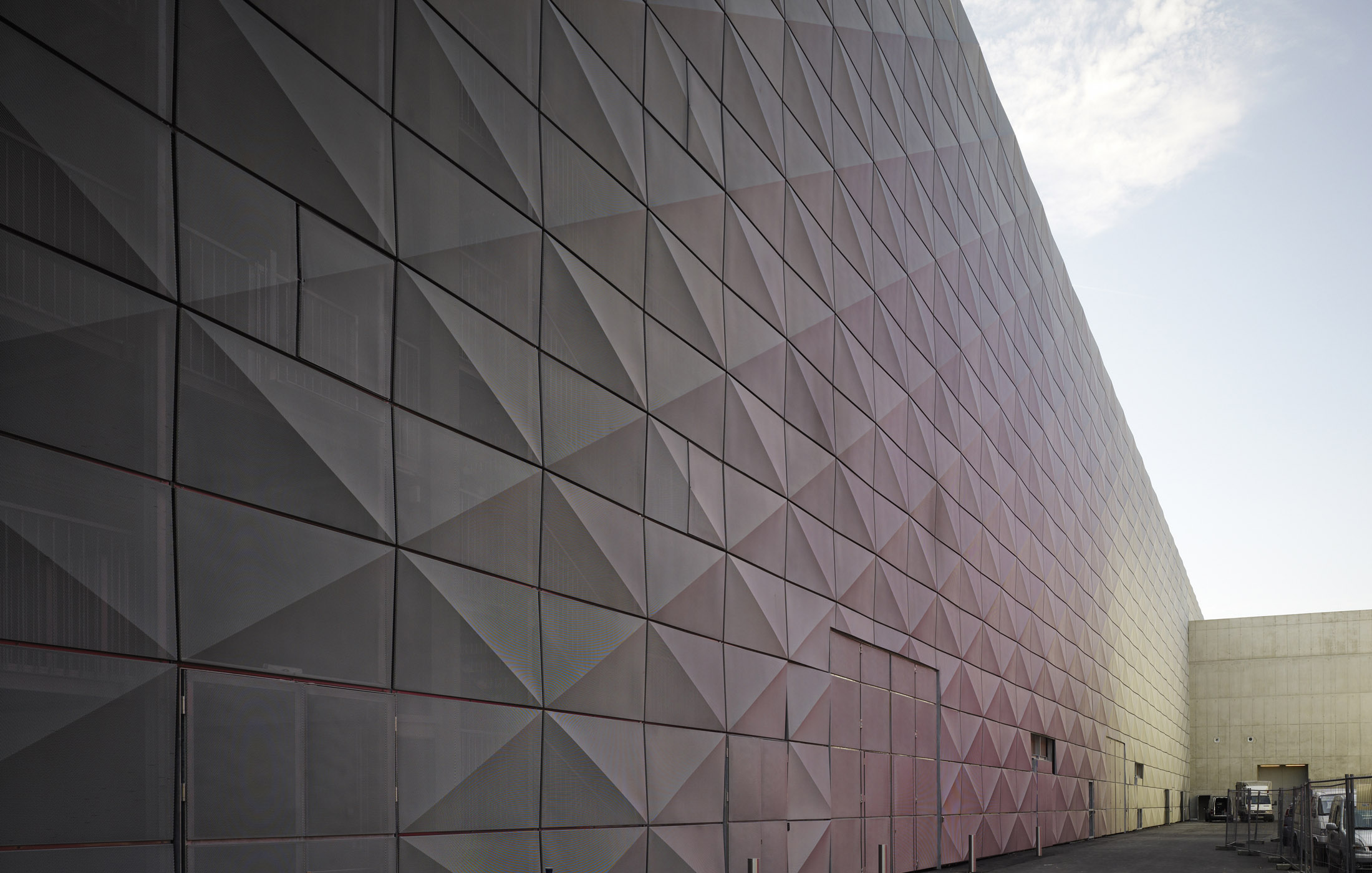 Die 2008 fertiggestellte Halle A der Messe Graz ordnet sich zurückhaltend in den bestehenden Messekomplex und Städtebau ein und präsentiert sich gleichermaßen signifikant, modern und eigenständig. Die silbrig schimmernde Fassadenmembran legt sich wie ein Schleier über die Betonstruktur des Gebäudes. Dabei wirkt die Fassadenstruktur abhängig von Tageszeit, Wetter, Sonnenstand und Blickwinkel mal homogen und geschlossen, mal transparent, die Bauweise und das Innenleben des Baukörpers freigebend. Die technische Funktion der Fassadenelemente liegt in der Reduktion des einfallenden Sonnenlichtes. Dabei bleibt durch die Beschaffenheit des durchlässigen Materials immer der Blick nach Außen erhalten.