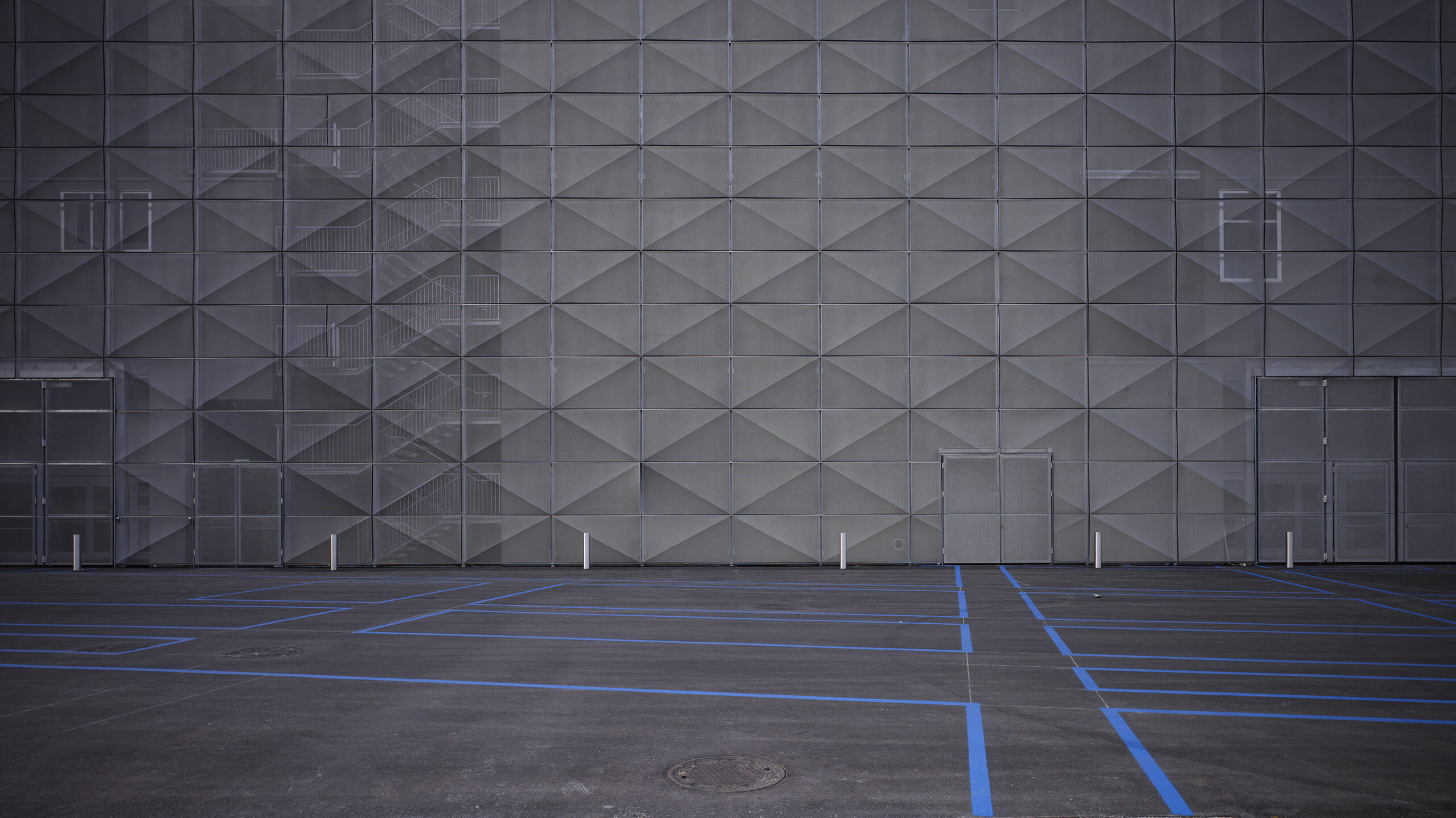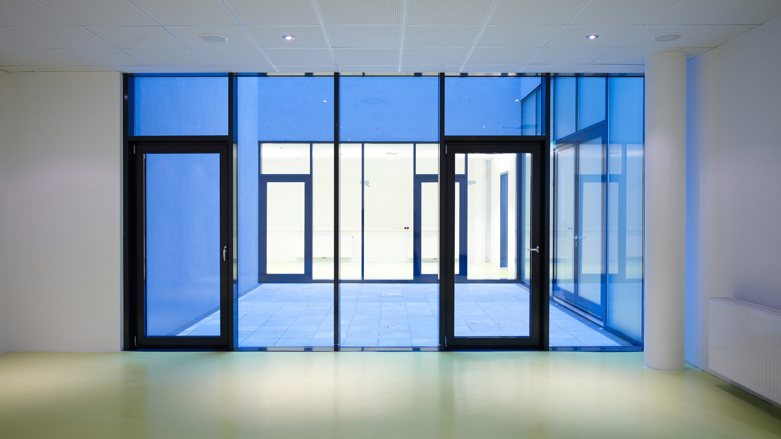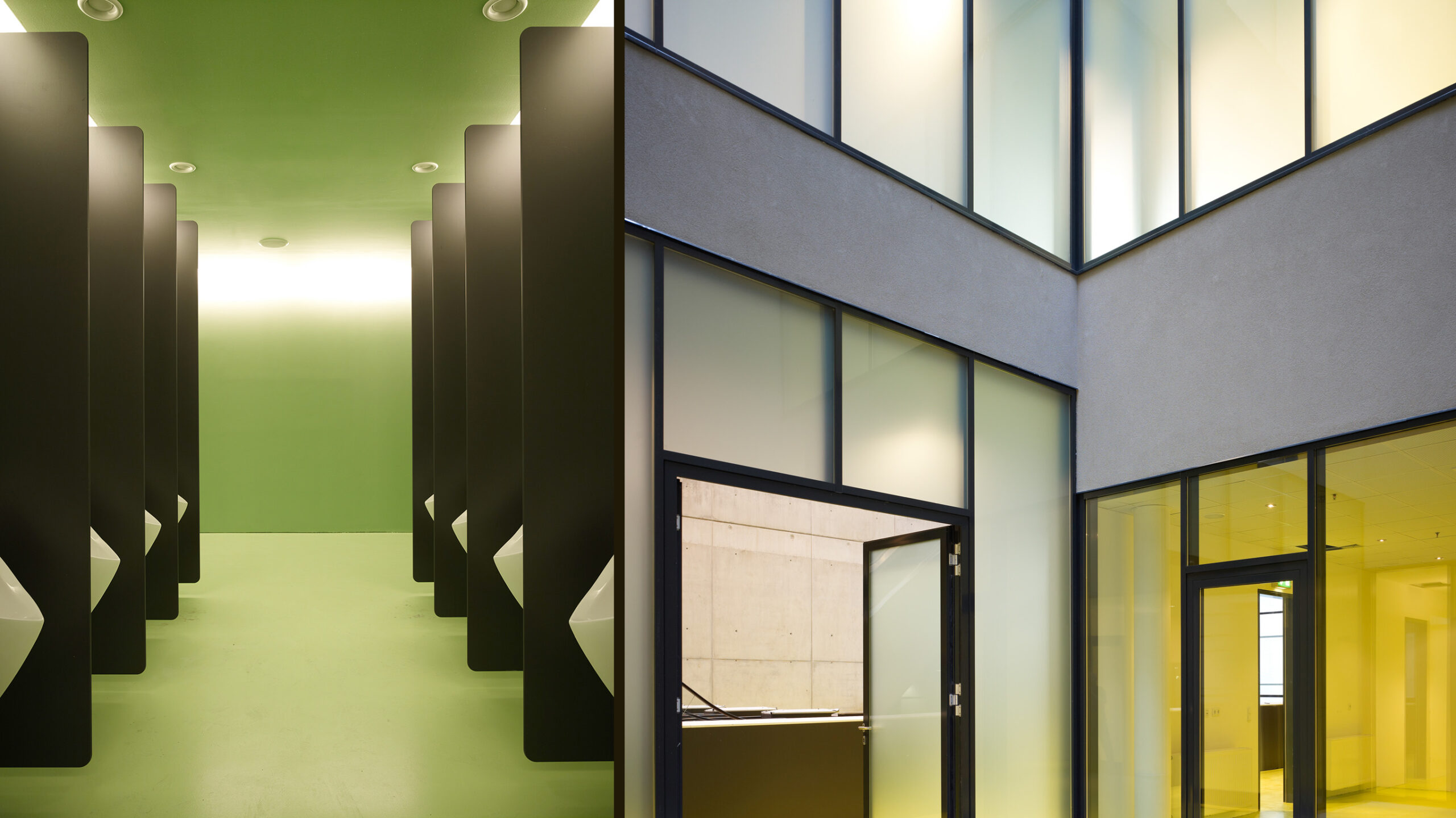 Die an die Foyers angegliederten Funktionsräume wirken durch die Reduktion auf ihre einheitliche Farbe, Kontraste und dekorlose Beleuchtung schlicht und elegant.