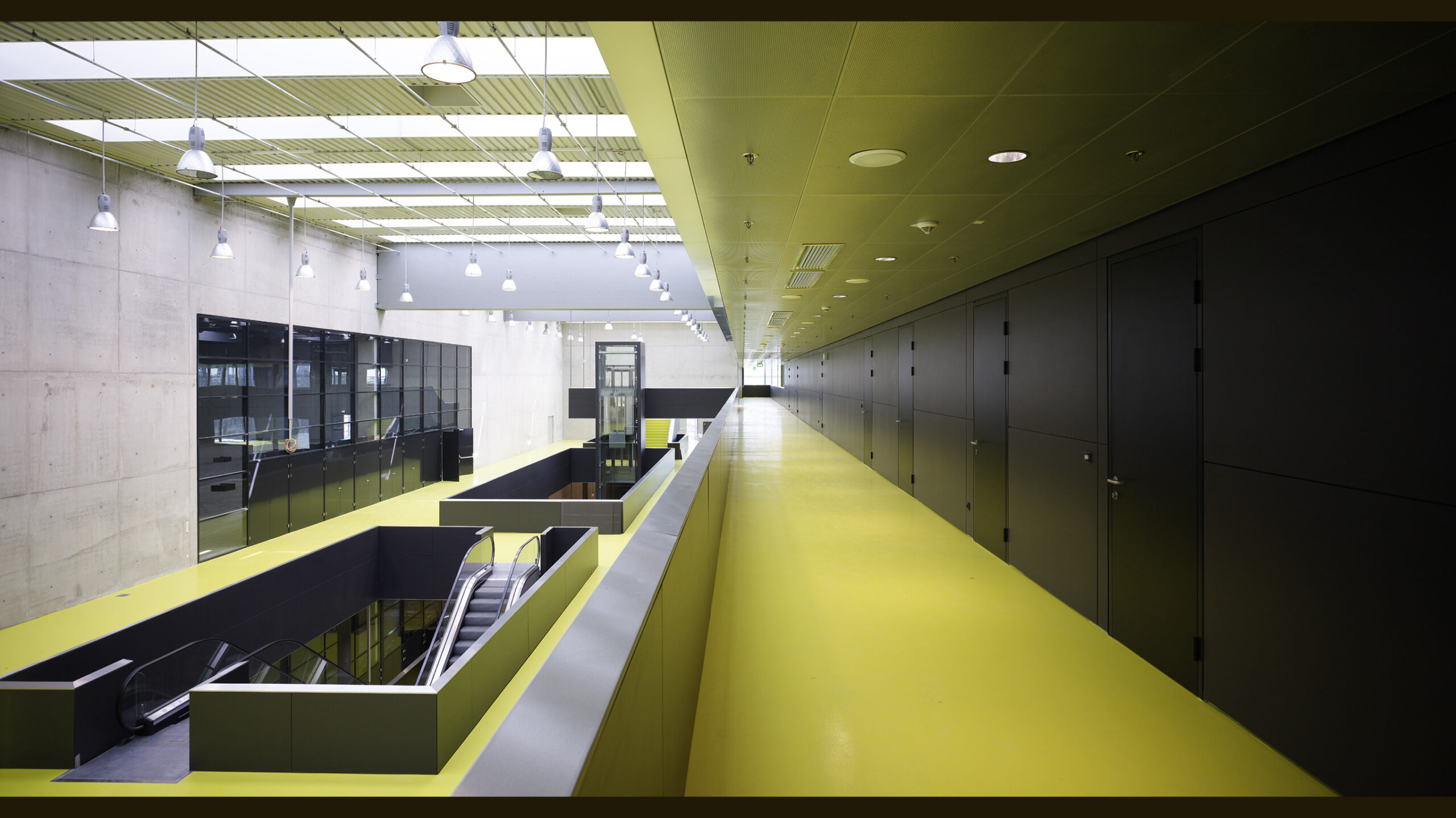Die Foyers öffnen sich mit großzügig verglasten Fensterflächen sowohl zum Außenraum als auch zu den Ausstellungshallen, welche mit tageslichtähnlicher Lichtfarbe ausgestattet wurde. Dadurch entsteht die Assoziation eines Außenraumes. Das Foyer mit warmweißer Lichtfarbe stellt somit als Innenraum spürbar den Verteiler dar.