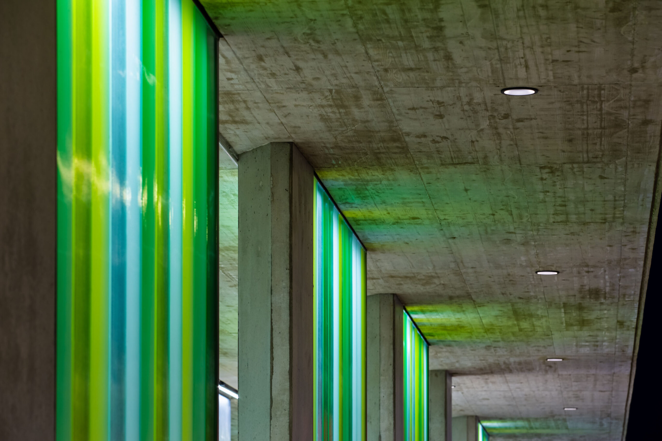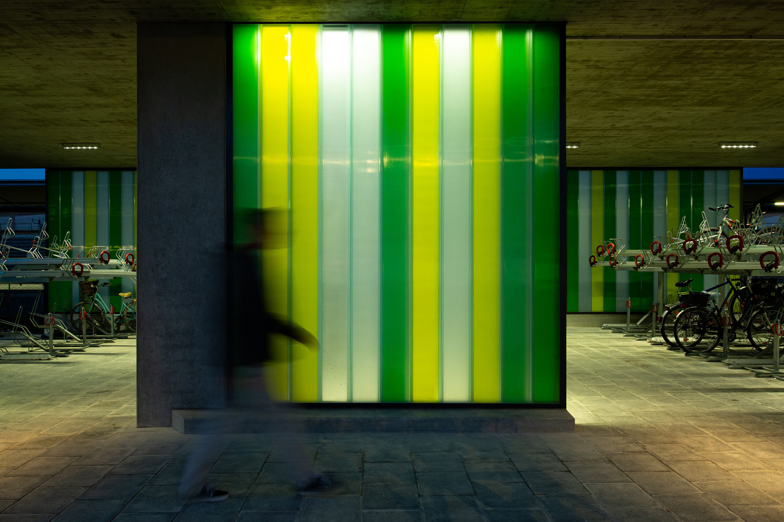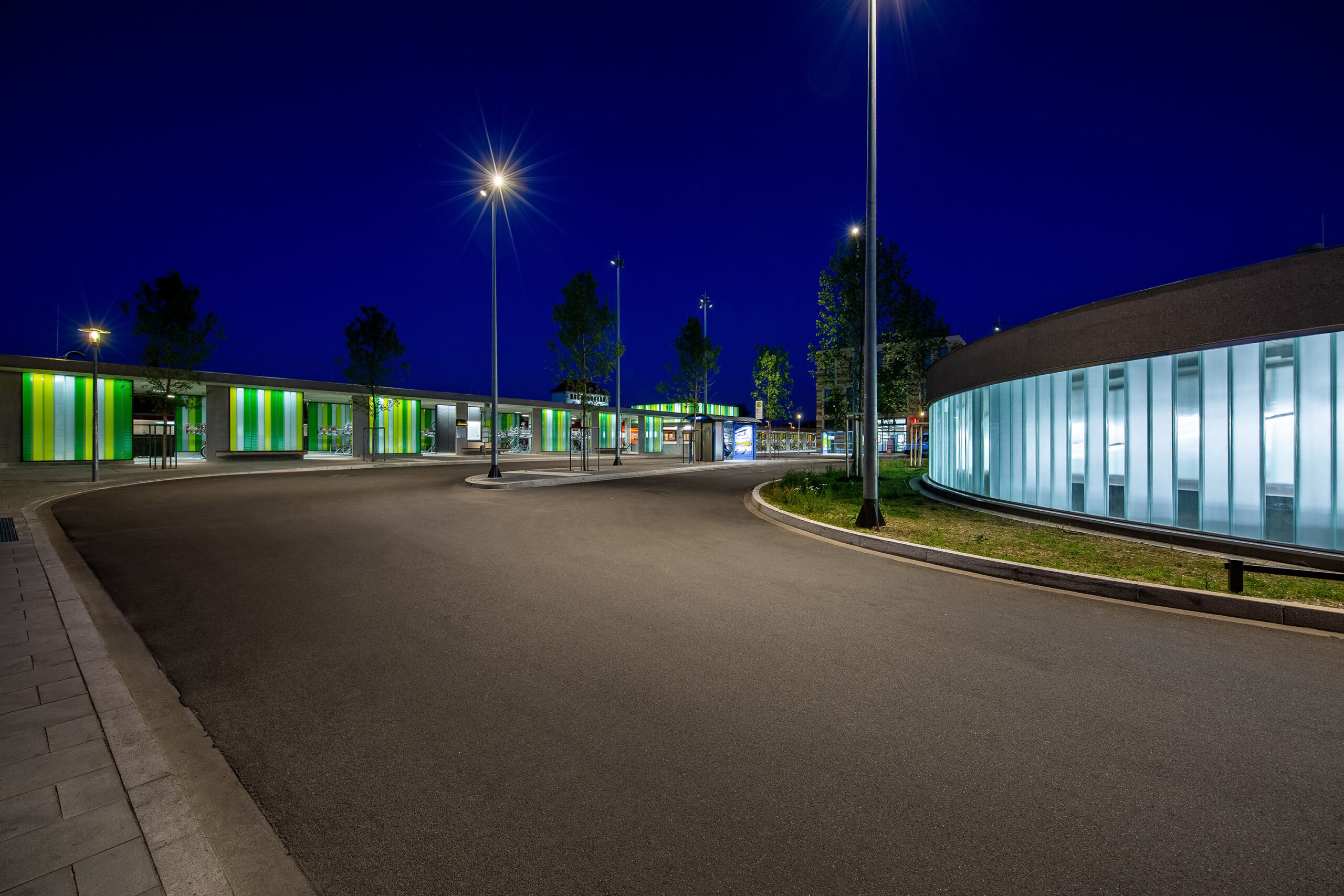 Die Beleuchtung geht auf die Unterschiede der Platzabfolgen ein und unterstützt die Raumdefinition durch Fassadenbeleuchtungen. Durch die Hinterleuchtung der Glaselemente hebt sich die Farbgestaltung im abendlichen Bild besonders hervor.