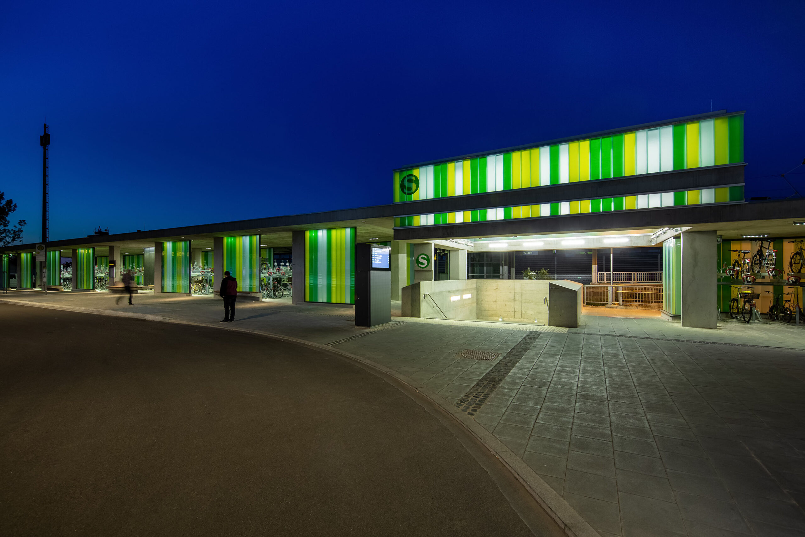 Die Platzräume definieren sich durch die umliegenden Gebäudefassaden. Die neue Identität entsteht durch die neu entstandenen Fassaden: Das neue Ensemble mit Einkaufszentrum EVER’S und dazugehörigem Geschäftshaus und die nach Norden zur Bahnlinie hin abschließende Bike & Ride Anlage inklusive Zugangsgebäude zum S-Bahnhof. Letztere beide prägen den Ort besonders durch ihre farbig gestalteten Stegverglasung, die industriell aber auch zugleich als modernes und unikates Baumaterial im Stadtraum anmutet.
