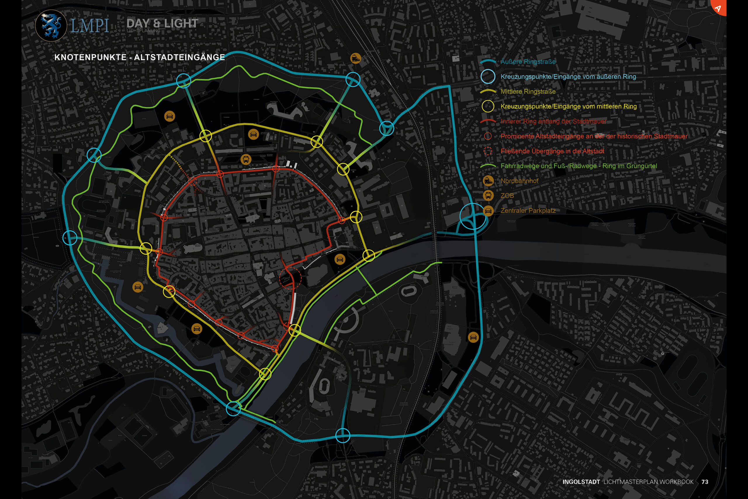 Der Lichtmasterplan Ingolstadt (LMPI) setzt sich mit der gezielten Ordnung und Gestaltung des städtischen Lichtbildes auseinander. Er soll ein praxistaugliches Werkzeug für die Stadtplanung der kommenden Jahre sein – ganzheitlich, nachhaltig und gestalterisch fundiert. Ziel ist es, ein ausgewogenes, charakterstarkes und umweltschonendes Nachtbild zu schaffen, das sowohl die historische Altstadt als auch moderne Stadtbereiche angemessen berücksichtigt.