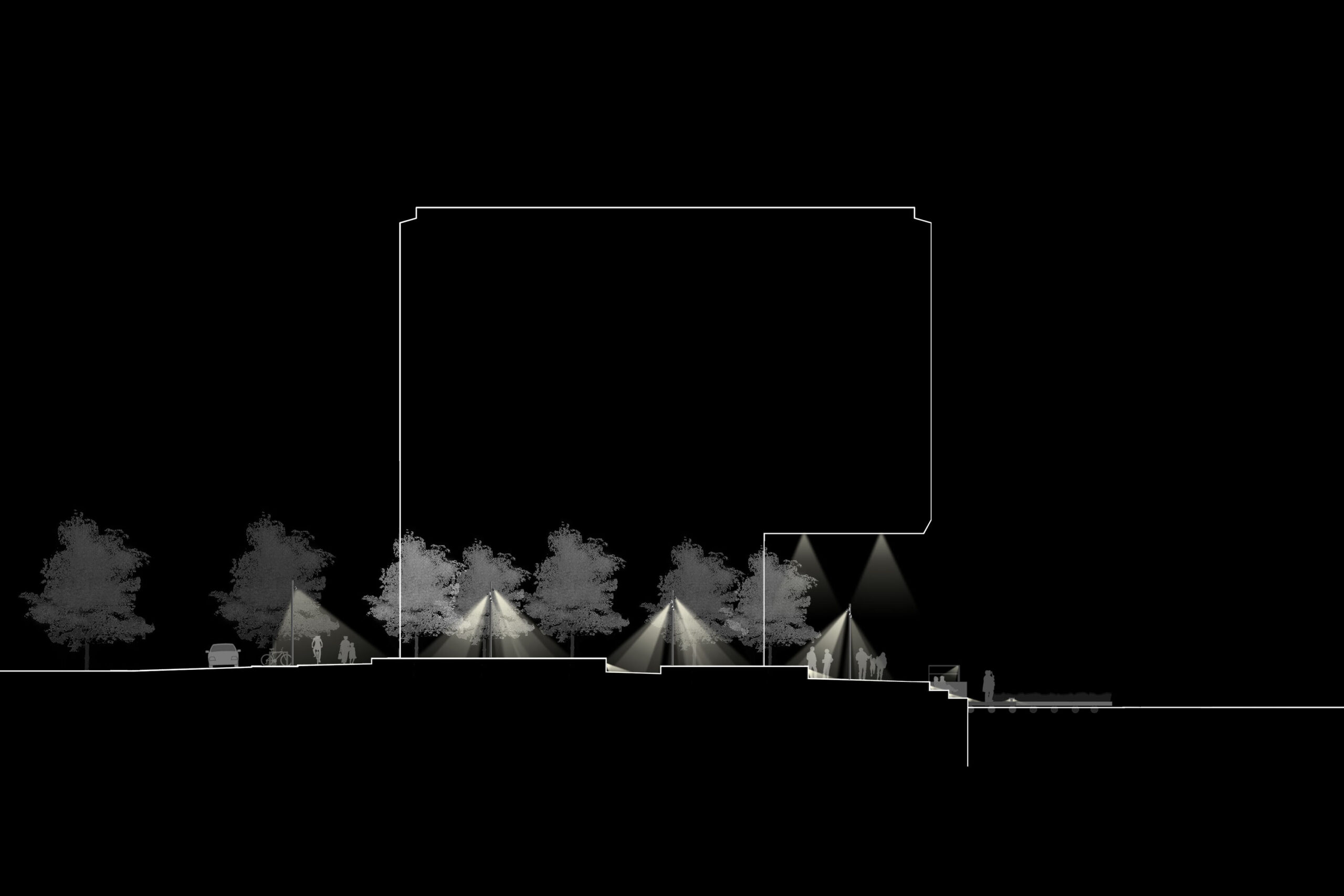 Lediglich die Baumhalle des Gebrüder-Wright-Platzes erhält eine Aufhellung durch Seilspannleuchten, die zwischen den Baumkronen ein lebendiges Licht- und Schattenspiel erzeugen.