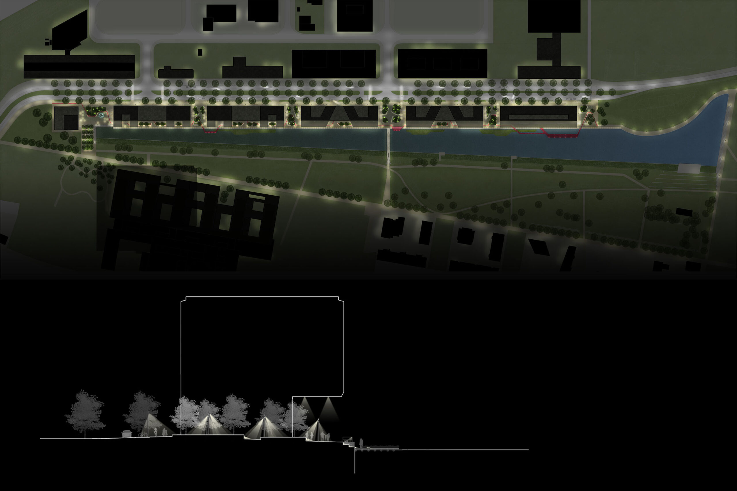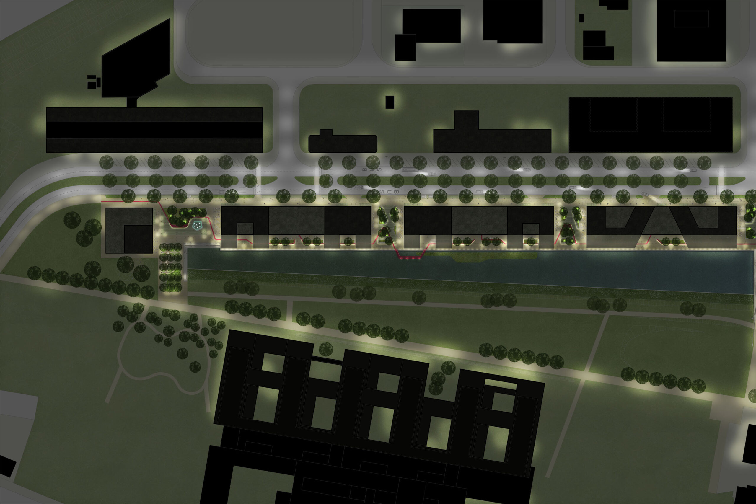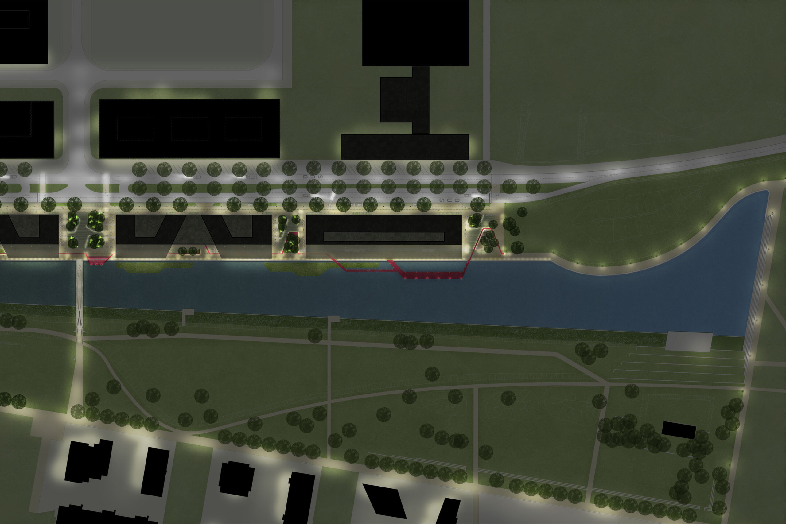 Lichtkonzept | Die Beleuchtung greift den Wechsel von auskragenden Gebäude mit eingebauten Downlights zu freien Flächen mit Mastleuchten auf und schafft über die Länge der Uferpromenade einen übergeordneten Rhythmus und Dynamik. Auch die in die Brüstung integrierten Lichtpunkte soll gezielt keine Linearität erzeugen, sondern für einen untergeordneten Rhythmus sorgen, ablesbar durch das Lichtbild auf dem Boden. Der Blick über den See bleibt aus den meisten Perspektiven ungestört und blendfrei.