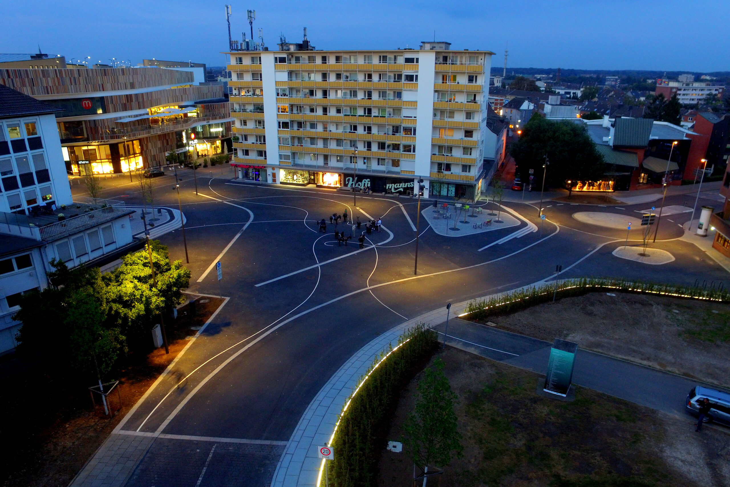 Die Beleuchtung hebt durch frei verstreute Lichtinseln die lebendige Bespielung hervor. Strahler an hohen Lichtmasten akzentuieren die Baumcluster und erzeugen, Plastizität und bringen durch Brillanz die in den Asphalt eingestreuten reflektierenden Anteile zum Funkeln.