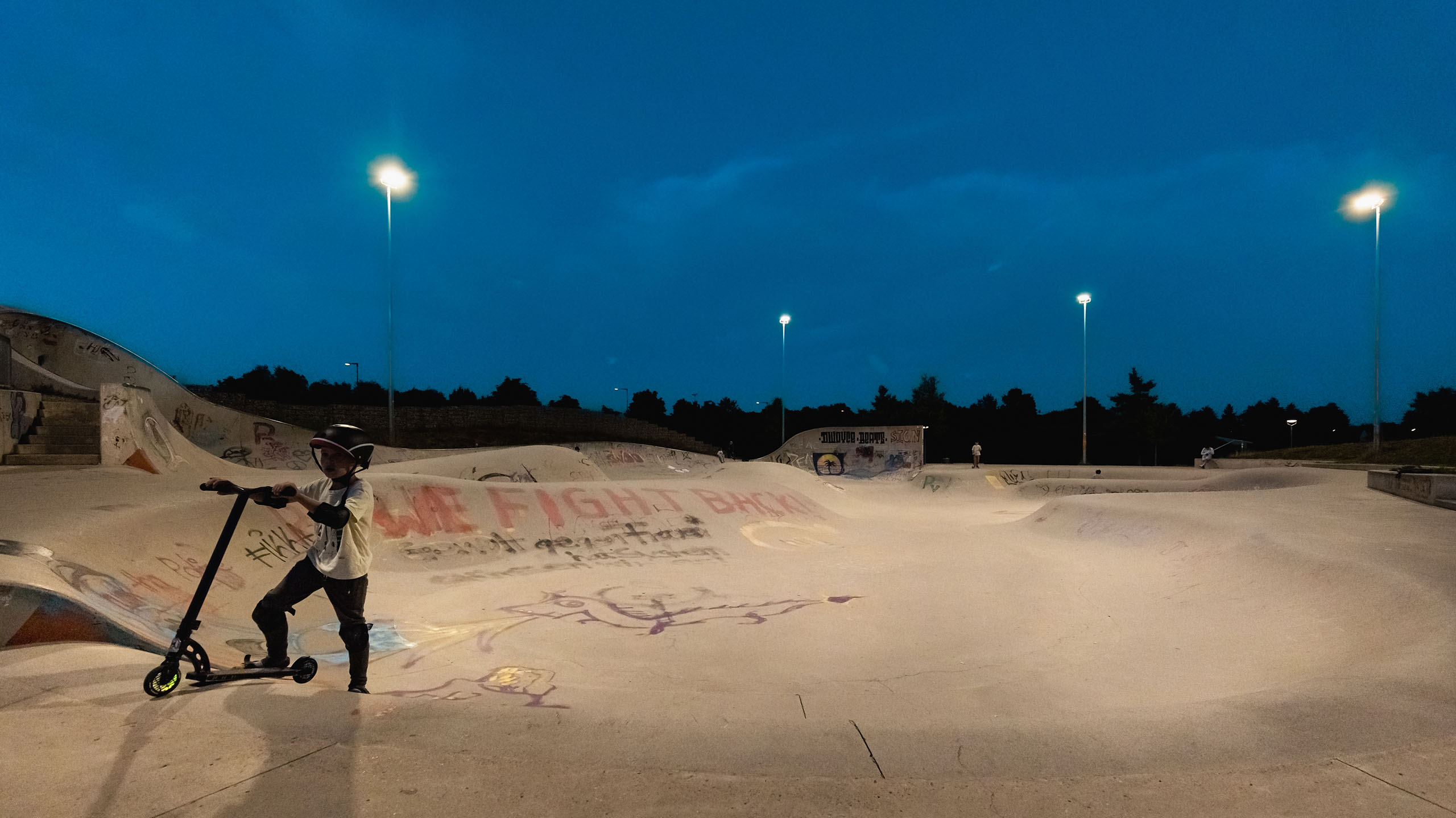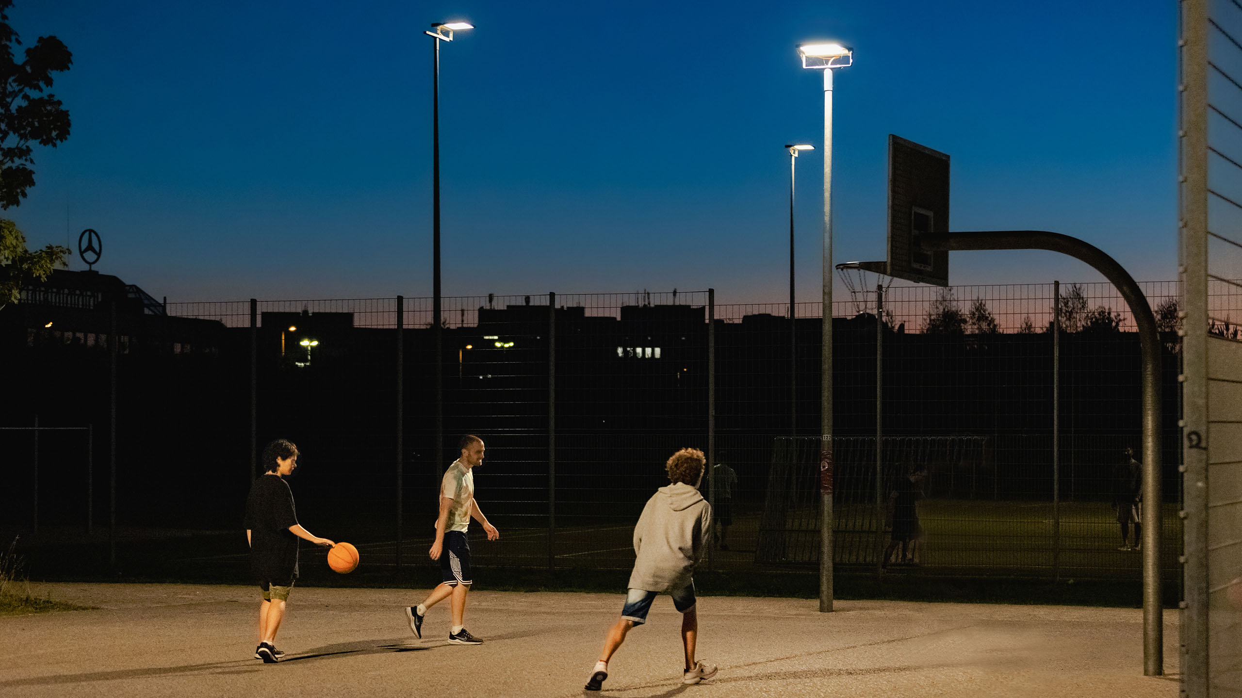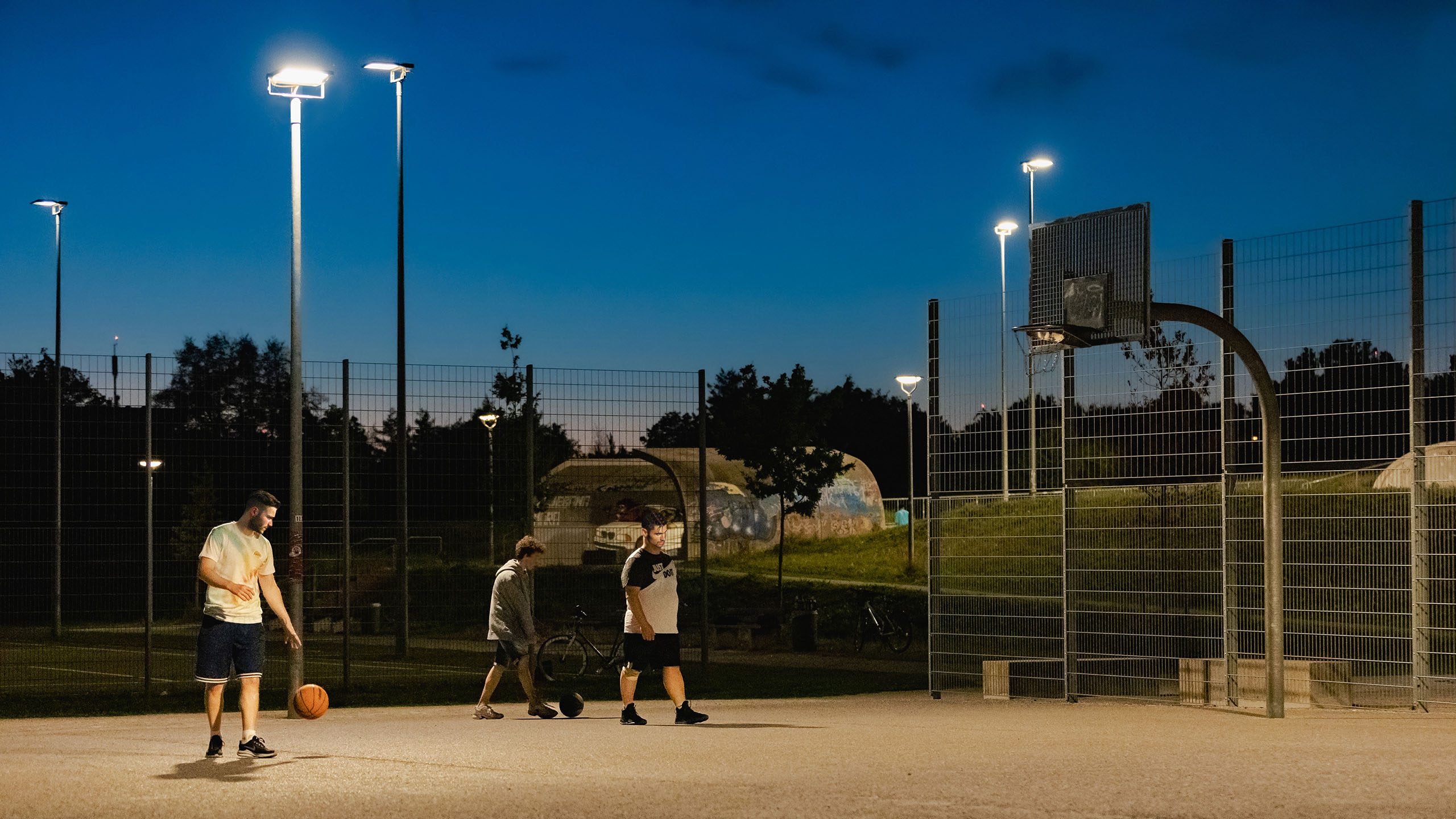 In Ramersdorf-Perlach befindet sich der weitläufige Vorstadtpark „Im Gefilde“. Inmitten der langgezogenen Wiesenlandschaft und geschwungenen Hügellandschaft liegt eine Spielanlage mit Fußball- Basketballplatz und einer großzügigen Skateanlage. Die Anlage, bereits seit 2012 in Betrieb, ist bei den München beliebter Anlaufpunkt für Sport und Spiel. Spektakuläre Sprünge mit Skates, Boards und Scootern sind hier den ganzen Tag über zu sehen, und damit es auch Abends weitergehen kann, wurde schließlich eine Lichtanlage ergänzt. Eine gleichmäßige Ausleuchtung mit wenig Schattenwurf ermöglicht gute Sicht für Sport und Stunts – gleichzeitig bleibt die Lichtimmission weitestgehend auf die Anlage begrenzt.