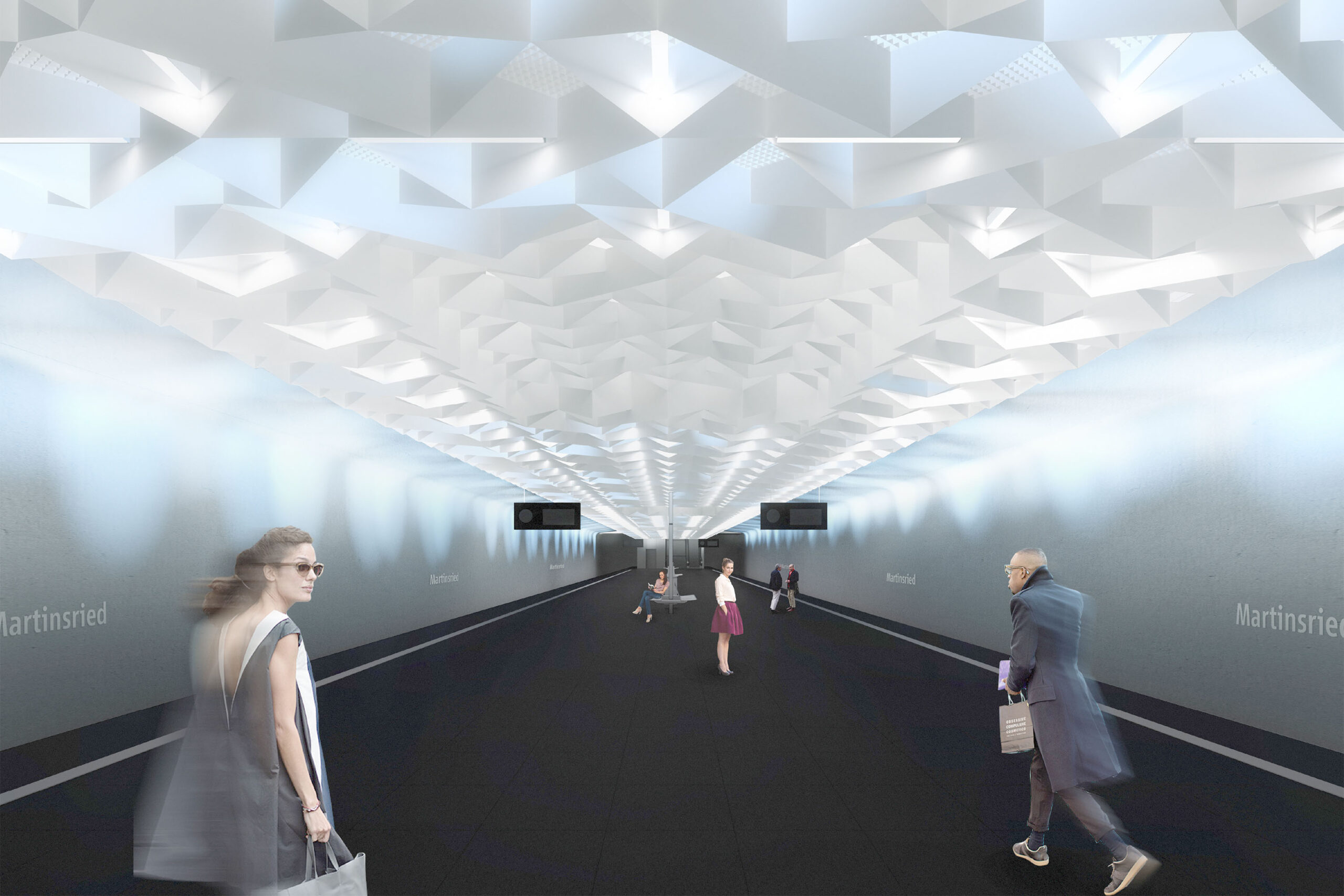 Die Öffnungen zur Oberfläche sorgen tagsüber für einen klar wahrnehmbaren, aber nicht dominanten Tageslichteinfall. Über den Bahnsteigen entsteht ein großformatiger Helligkeitsrhythmus, der die Verbindung zur Stadt oberhalb sichtbar macht.