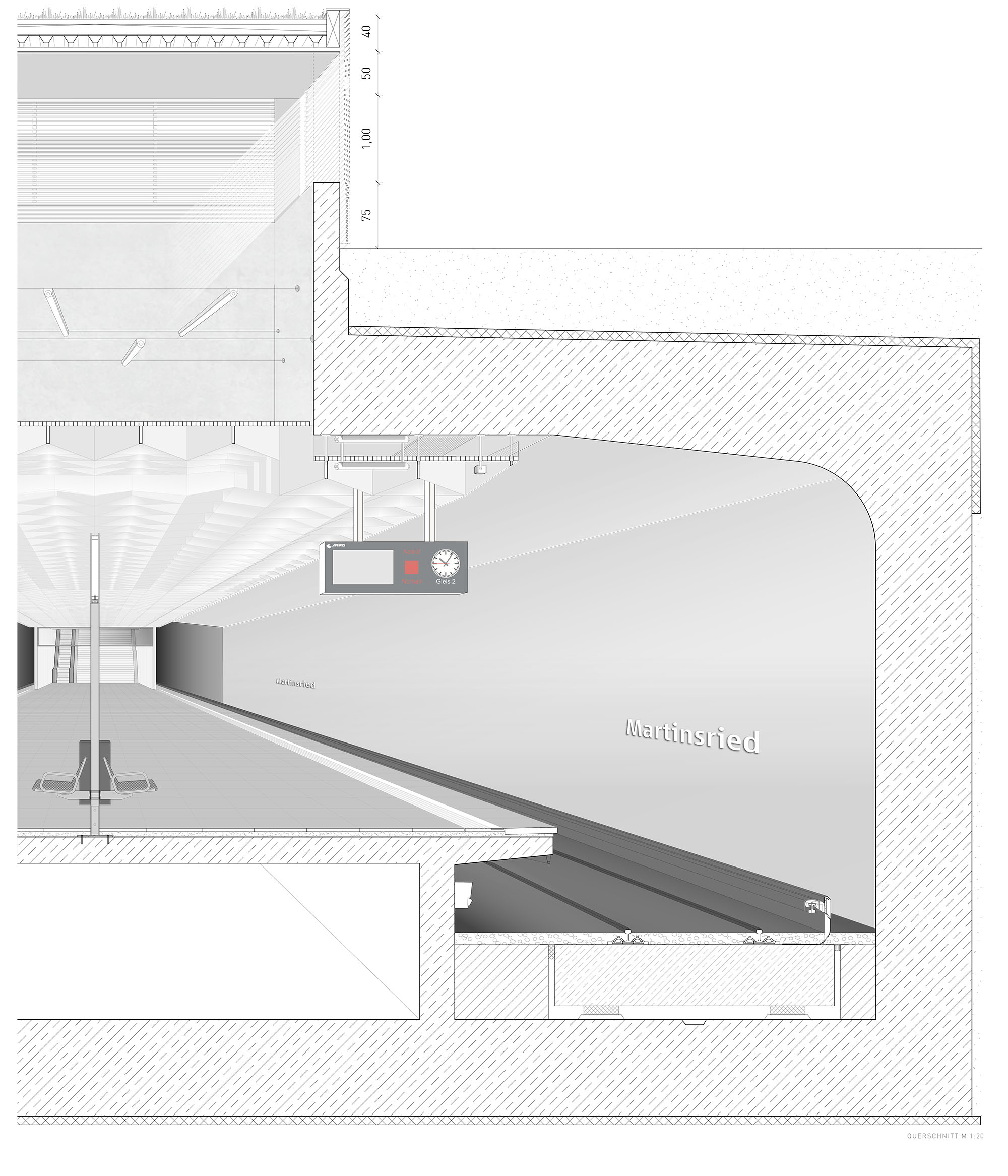 Die Beleuchtung ist weder reine Funktionsbeleuchtung noch bloßer Effekt. Tageslicht und Kunstlicht machen die besondere Lage der Station unmittelbar unter der Oberfläche spürbar – mit direktem Bezug zum Außenraum. Bereits im Treppenabgang wird der Übergang von oben nach unten, von hell zu dunkel, inszeniert: Am Bahnsteigbeginn erhöht sich die Beleuchtungsstärke deutlich, die Schwelle wird visuell aufgehoben. Auf dem Bahnsteig angekommen, erscheint die Decke, als würde sie sich in Licht und Form auflösen.