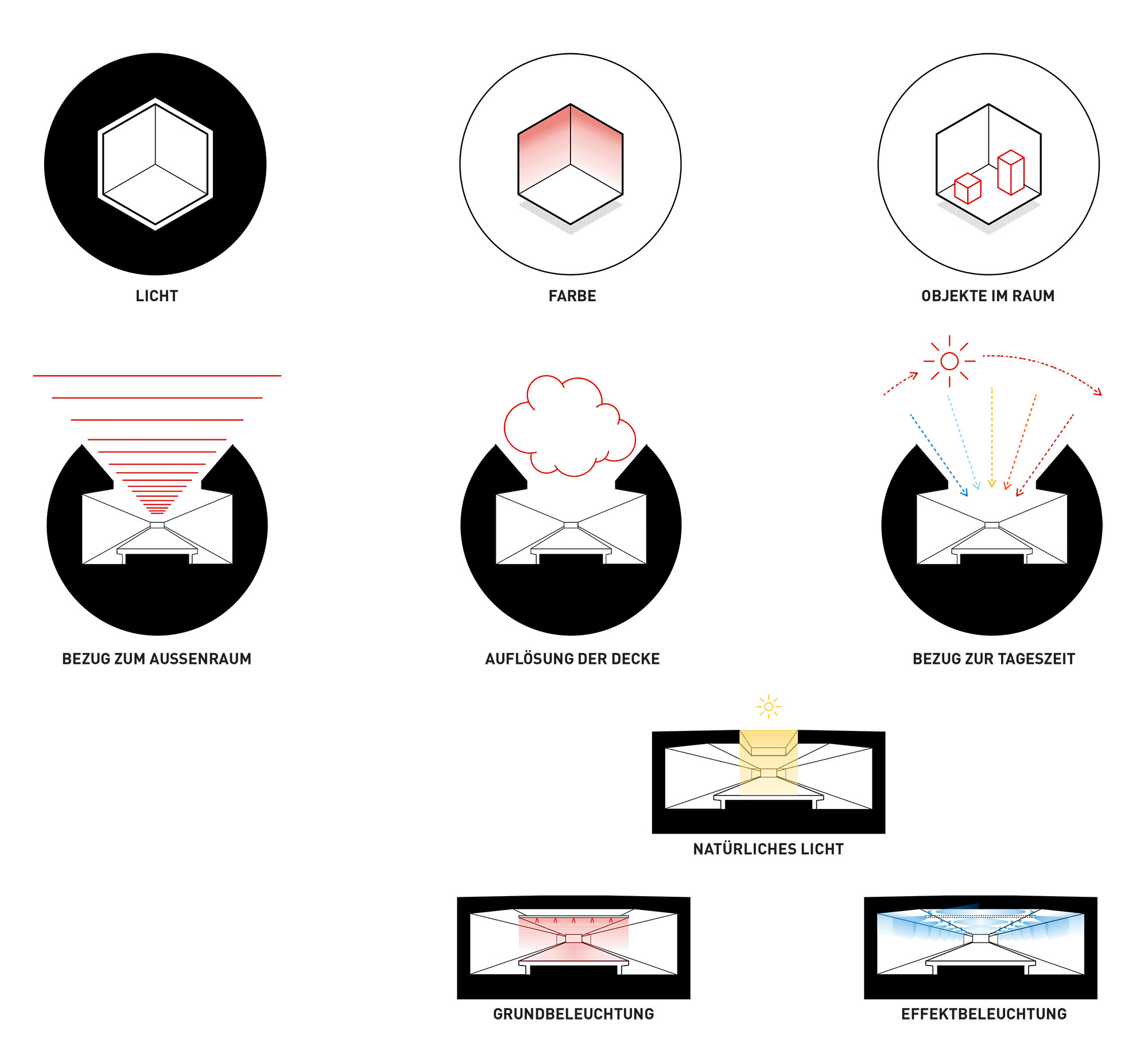 In die Deckenstruktur integrierte, energieeffiziente LED-Lichtrohre leuchten die Bahnsteigfläche funktional aus und hellen zugleich die Decke auf. Sie sind von unten frei zugänglich, im flachen Betrachtungswinkel jedoch nicht sichtbar. Oberhalb der Decke angeordnete, regelbare Lichtrohre mit bernsteinfarbenen und blauen LEDs verändern die Lichtfarbe im Tagesverlauf und schreiben sie als feinen Farbverlauf in die Deckenuntersicht ein.