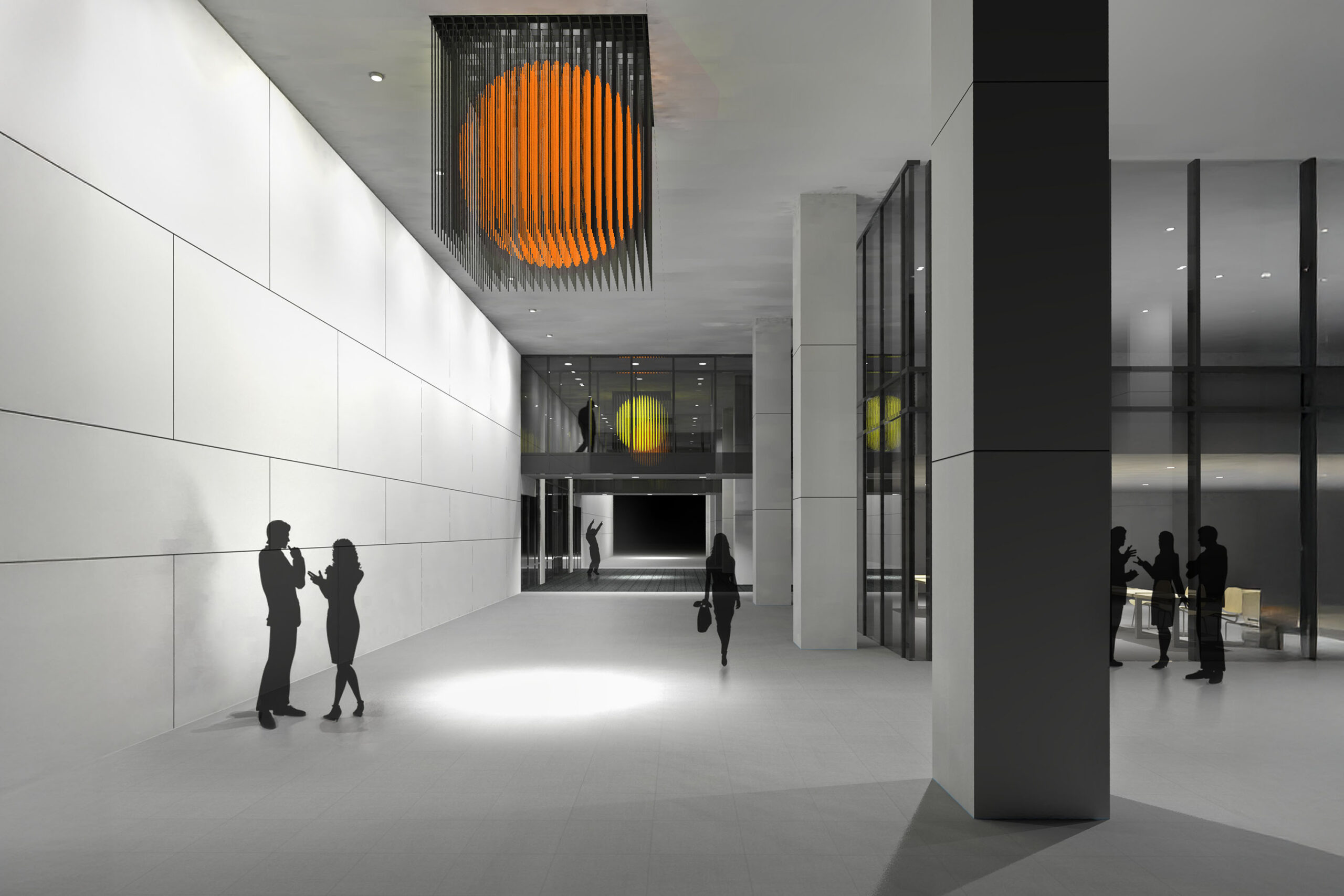 Im zentralen Kreuzungspunkt des Inneren schwebt eine weitere Kugel, welche sich lediglich durch ihre Farbigkeit unterscheidet. Besonders hier in dem Bereich, der am geringsten vom Tageslicht erreicht wird, entfaltet die Kugel besonders stark ihre leuchtende Wirkung und prägt den Raum.