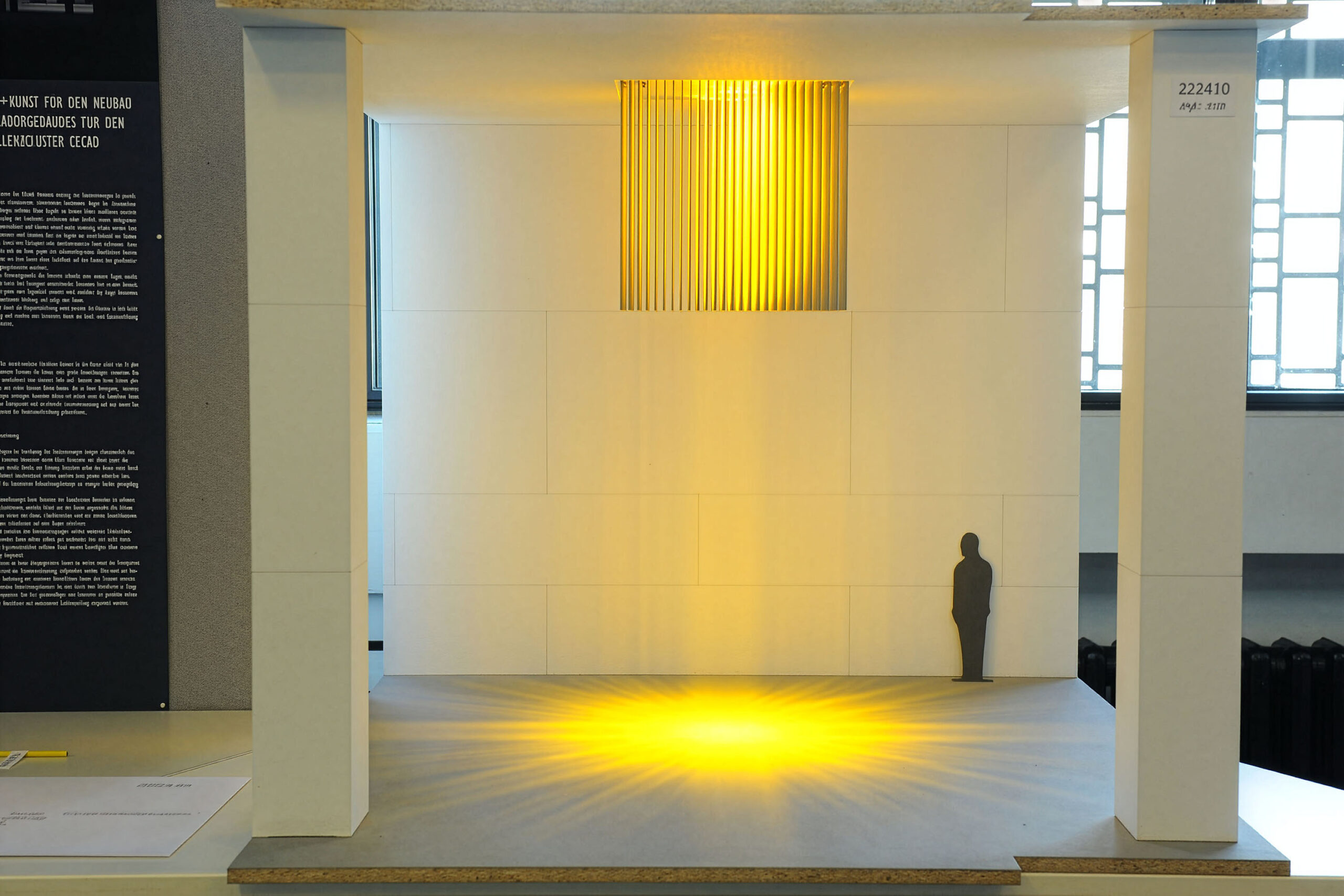 Um die Schwellenangst beim Betreten des überdachten Bereiches zu nehmen, wird die geschlossene, seitliche Wand aus der Decke angestrahlt. Die höhere Leuchtdichte weitet den Raum. Gleichermaßen wird der starke Leuchtdichteunterschied der Lichtflecken auf dem Boden relativiert.