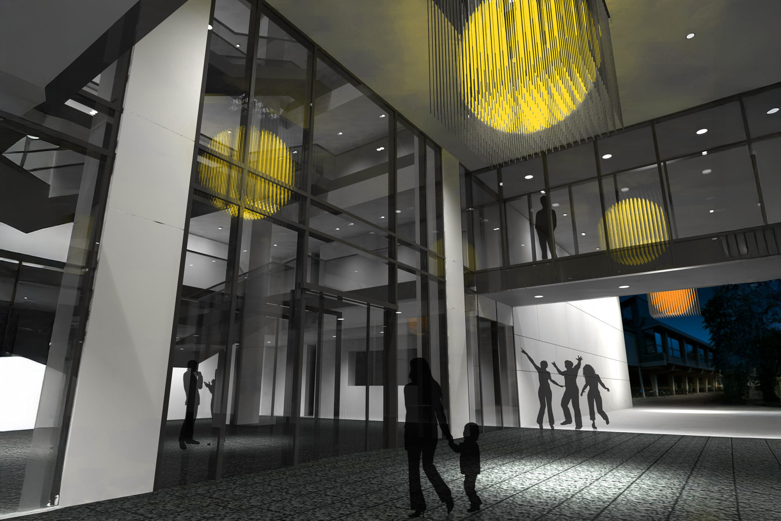 Raumwahrnehmung | Die drei Kugeln im Durchgang des Studentenweges prägen charakterlich den Raum. Sie kommen besonders durch klare Kontraste, vor allem gegen die sonst relativ dunkle Decke, zur Geltung. Trotzdem sollte der Raum nicht durch seine Dunkelheit abschreckend wirken sondern auch positiv erfahrbar sein. Dazu wird das bestehende Beleuchtungskonzept an wenigen Stellen geringfügig angepasst: