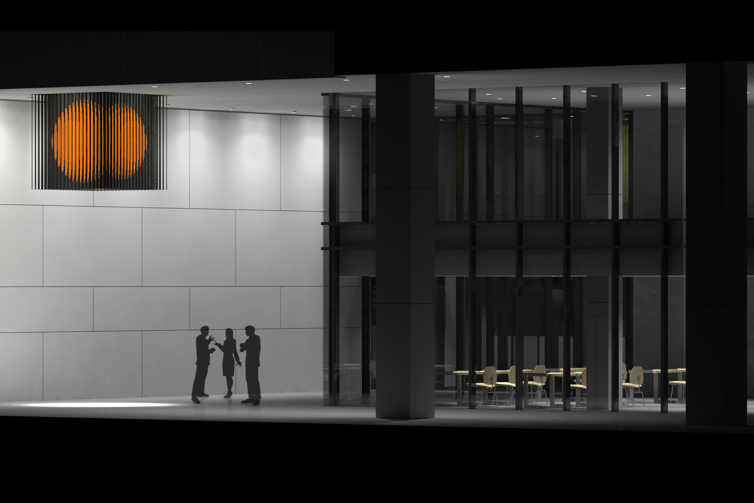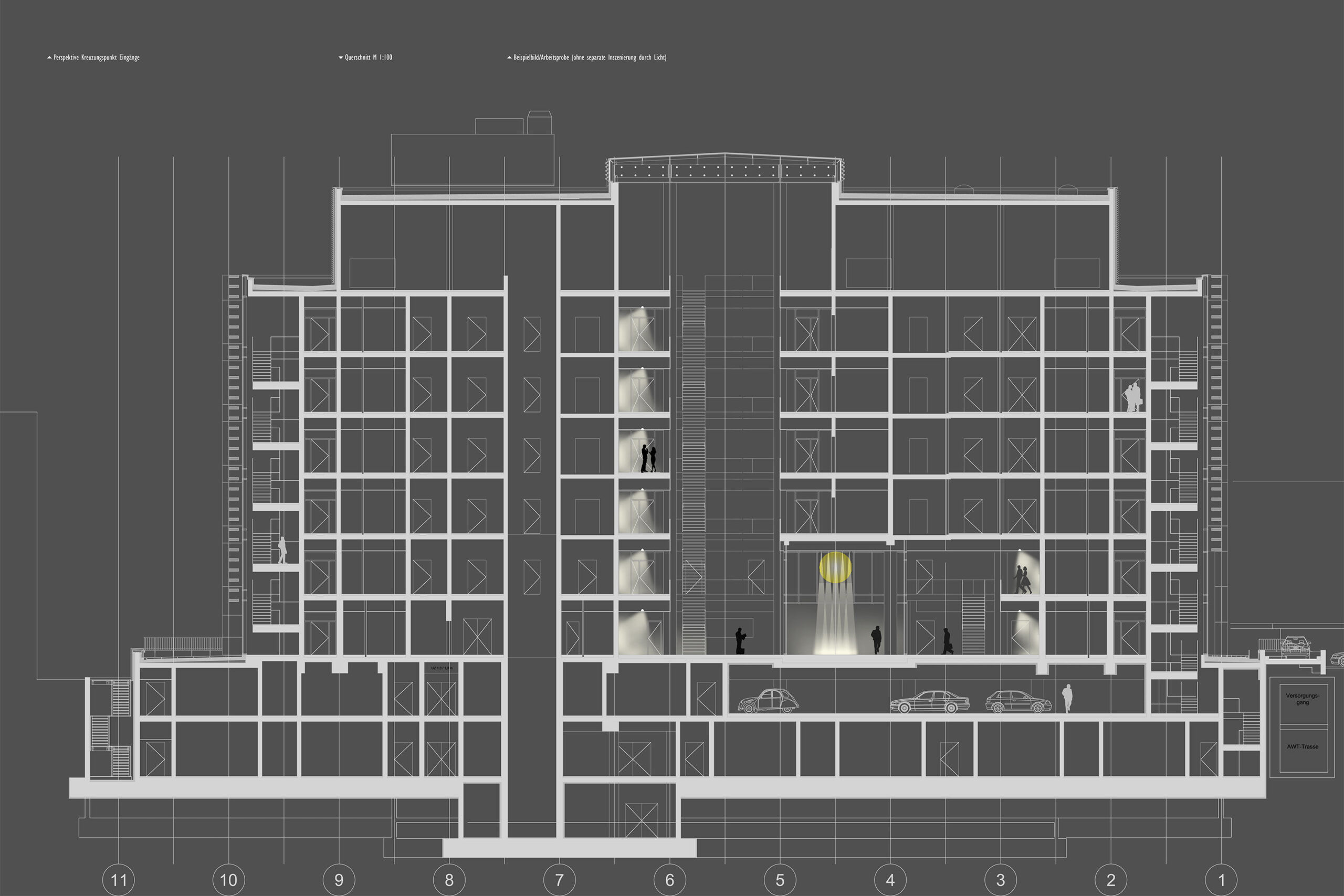 Um den Raum in beide Eingangshallen hinein zu weiten, muss die Transparenz verbessert und die Scheibenspiegelung aufgehoben werden. Dies wird am besten durch Aufhellung der mittleren Wandflächen hinter den Treppen erreicht. Im bestehenden Beleuchtungskonzept ist dies durch zwei Wandfluter je Etage bereits vorgesehen. Um dies gleichmäßiger und intensiver zu gestalten sollten hier mehr Wandfluter mit verbesserter Lichtverteilung eingesetzt werden.