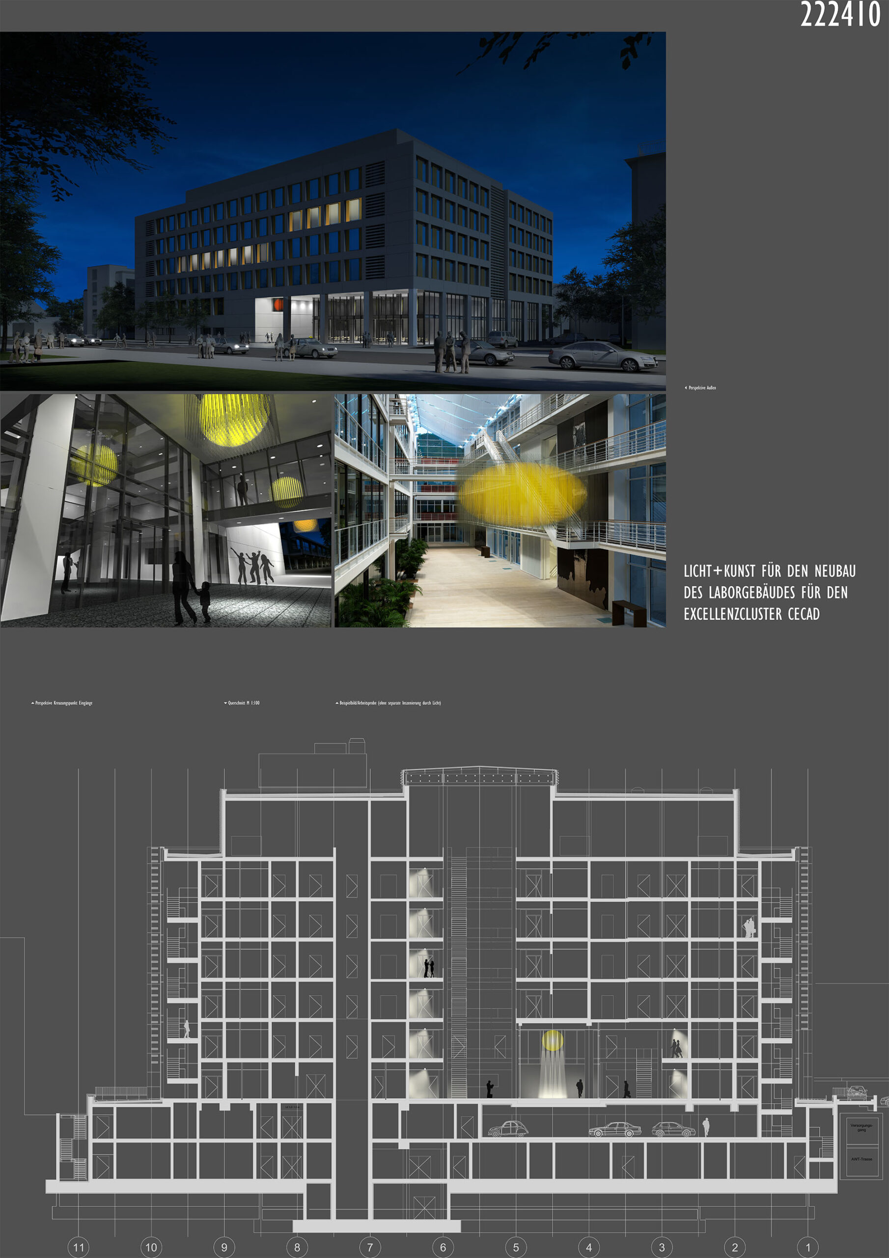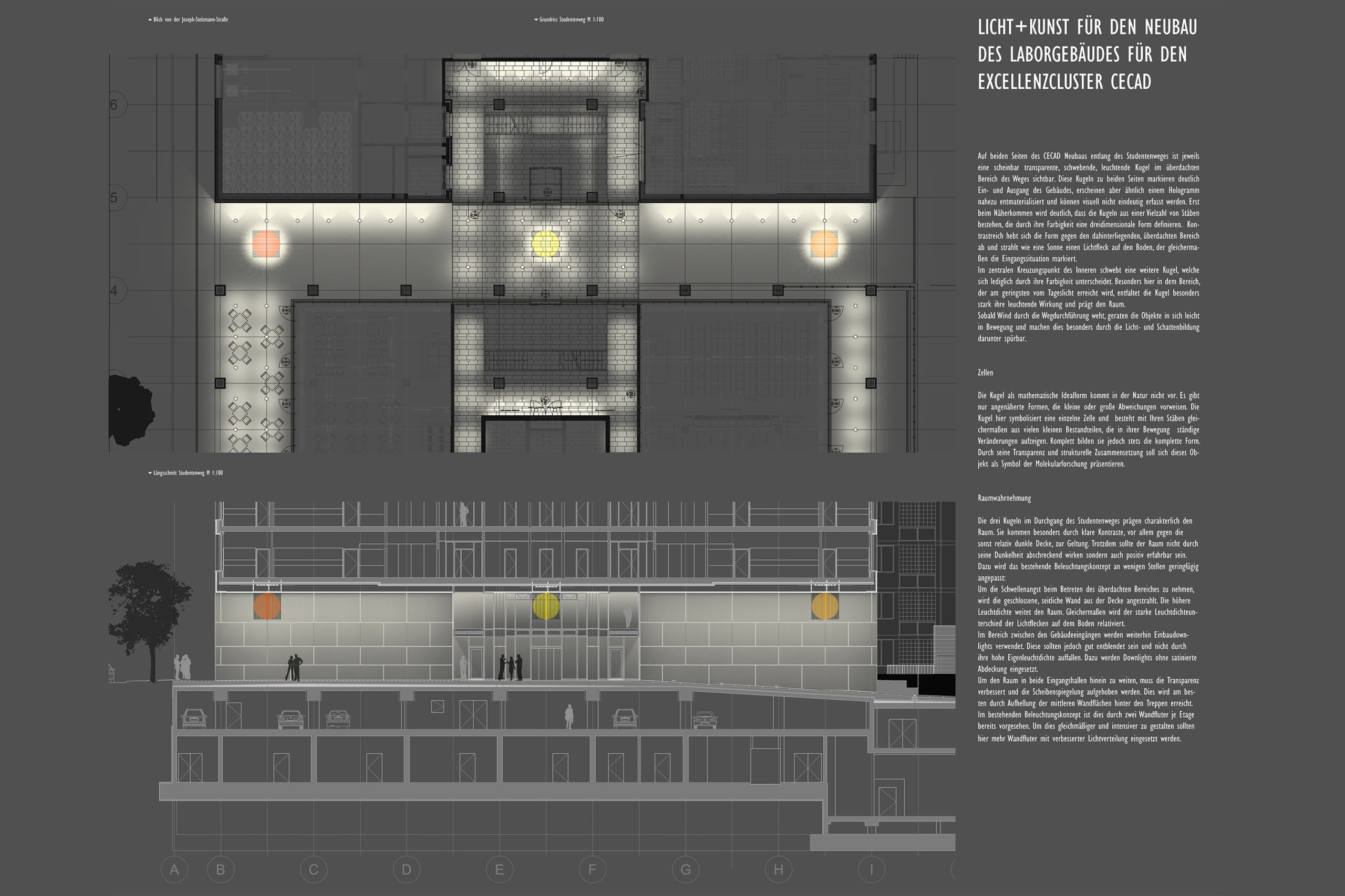 Auf beiden Seiten des CECAD Neubaus entlang des Studentenweges ist jeweils eine scheinbar transparente, schwebende, leuchtende Kugel im überdachten Bereich des Weges sichtbar. Diese Kugeln zu beiden Seiten markieren deutlich Ein- und Ausgang des Gebäudes, erscheinen aber ähnlich einem Hologramm nahezu entmaterialisiert und können visuell nicht eindeutig erfasst werden. Erst beim Näherkommen wird deutlich, dass die Kugeln aus einer Vielzahl von Stäben bestehen, die durch ihre Farbigkeit eine dreidimensionale Form definieren. Kontrastreich hebt sich die Form gegen den dahinterliegenden, überdachten Bereich ab und strahlt wie eine Sonne einen Lichtfleck auf den Boden, der gleichermaßen die Eingangssituation markiert.
